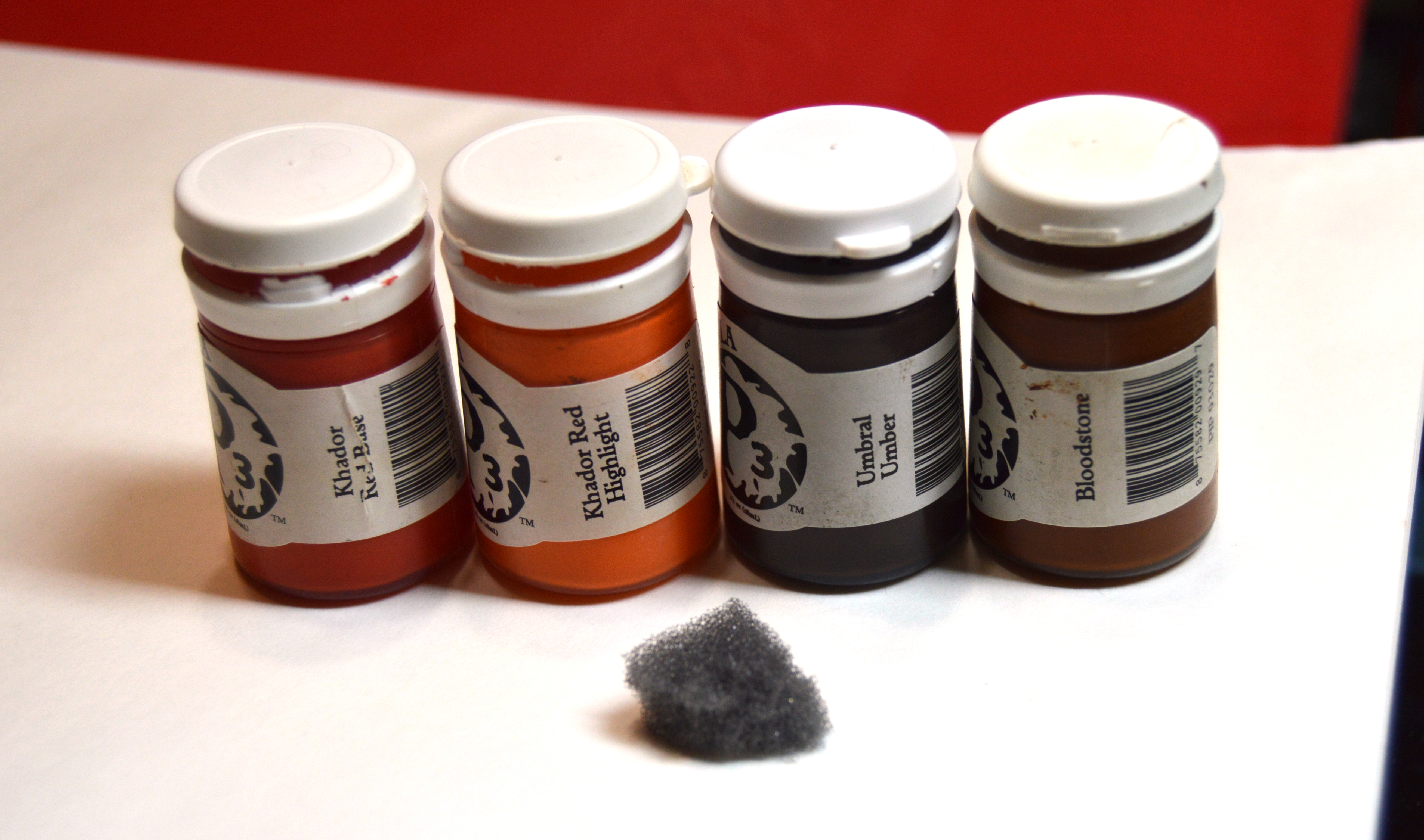Next take a bit of blister foam, and using it as a sponge, dab on spots of Khador Red Base, Khador Red Highlight, Bloodstone, and Umbral Umber.
