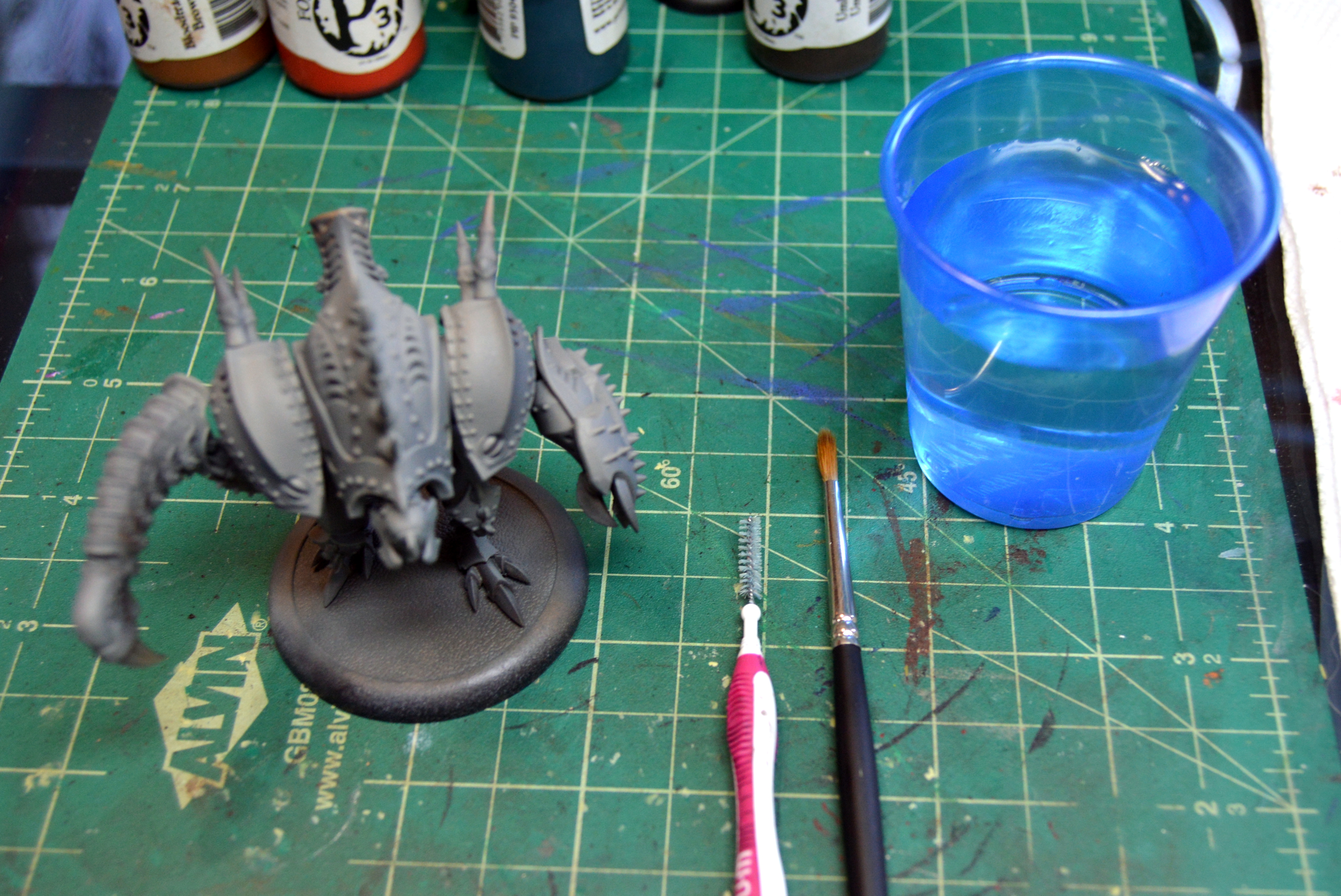 For this part you need a clean cup of water, a bristled dental pick, and a cheap, soft paint brush.