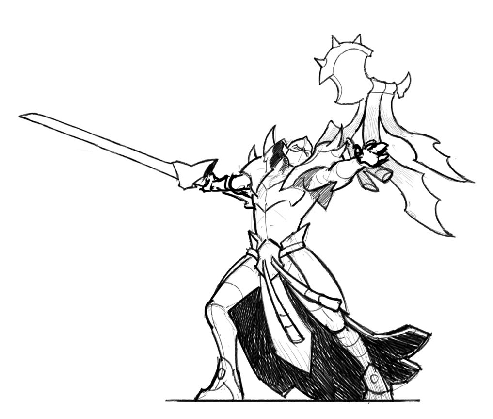 One of the tough parts about poses is that we have to take into account production challenges, painting, and the model’s presence on the table. Two-handed weapon poses aren’t reliable over time, as there may be shifting in the mold that makes fit difficult. It also makes painting a bit more challenging, and casting a two-handed pose is always harder. So, after a bit of discussion with Matt Wilson and Ed Bourelle, I quickly sketched the following revision based on #1 but with a little more flair for the dramatic and having him casting a spell with his sword at the ready. We were also able to reach a compromise, choosing pose #3 wholesale from the lot and my sketch chosen as an alternate.