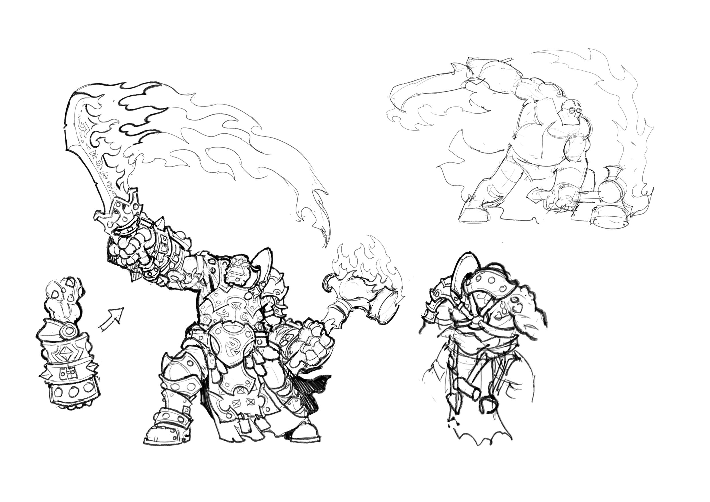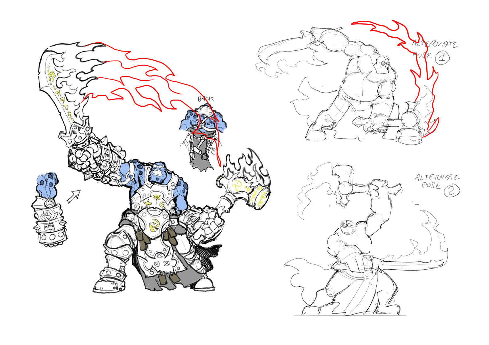 The fire didn’t feel intense enough, so we requested further emphasis to the flames on his sword and hammer . . .