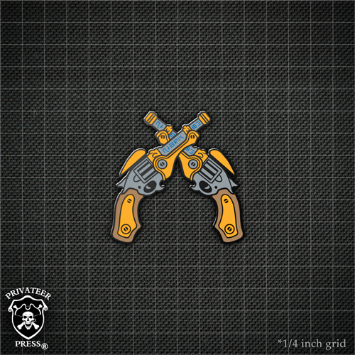 With the cereal pins wrapping up, we have an extremely cool line that launches in February: weapons of the Iron Kingdoms. First out of the gate are the Cygnar warcaster Allister Caine’s Spellstorm pistols and the axe called Rathrok, the World Ender, currently wielded by the Tharn warlock Kromac, Champion of the Wurm. Both pins are limited edition, so get them into your collection right away.