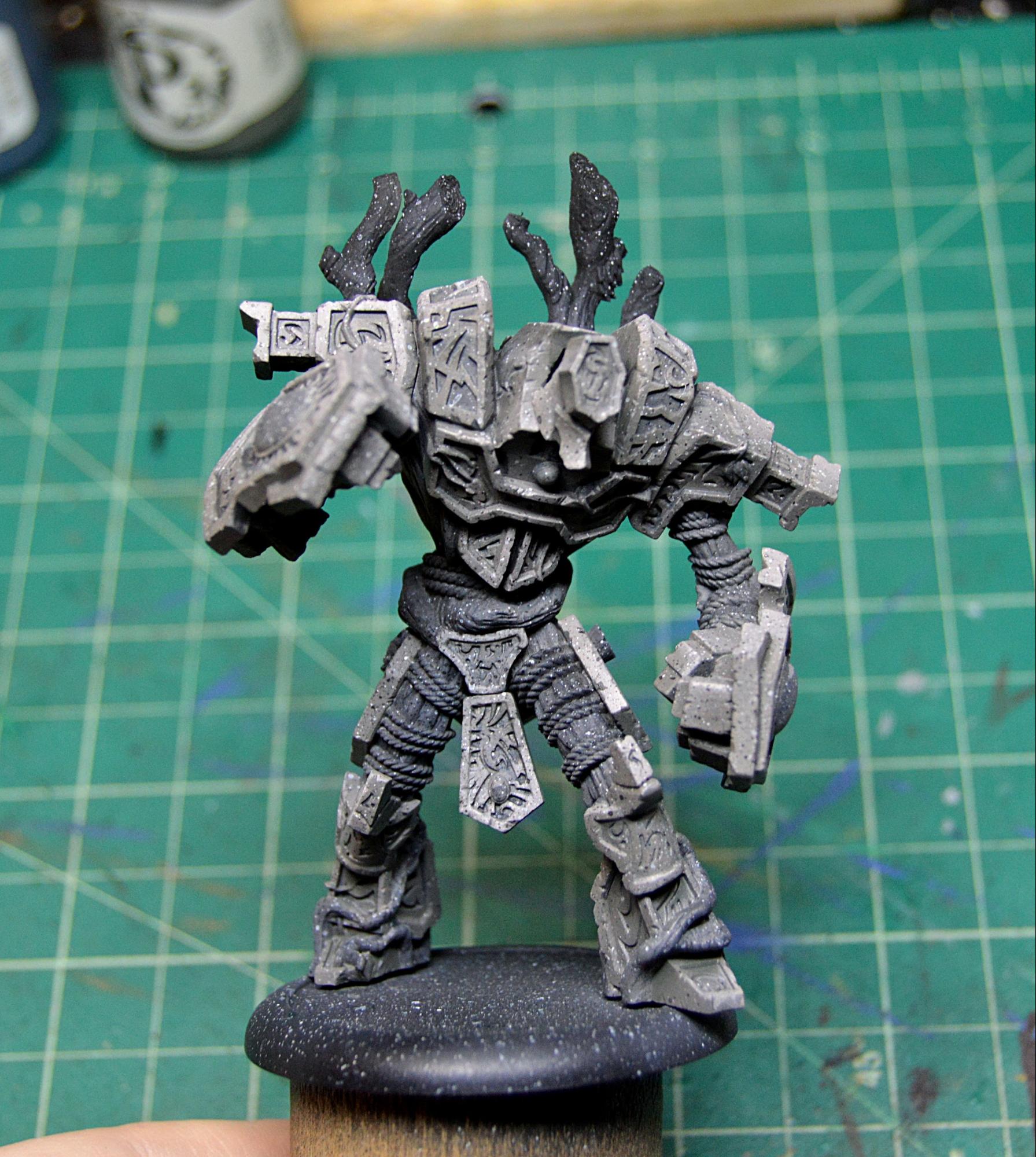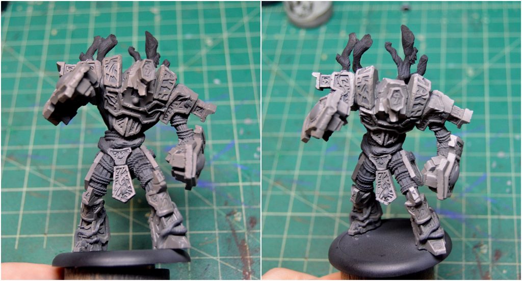 Assemble, clean, and remove the mold lines from Megalith with a sharp hobby knife. Prime with a couple of light coats of P3 Black Primer.