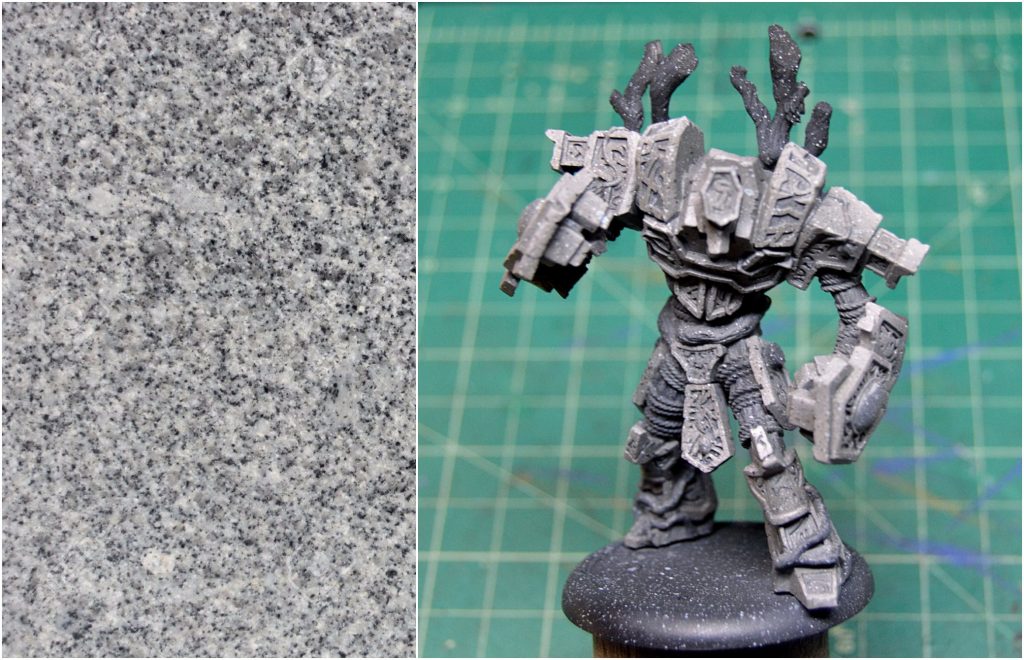 Basecoat the stone with Bastion Grey. After this, I usually do shadows first followed by highlights, but in order to get a granite look, the order has to be reversed. Highlight first by two-brush blending with a 50/50 mix of Bastion Grey and Trollblood Highlight, and then do a second highlight with straight Trollblood Highlight.
