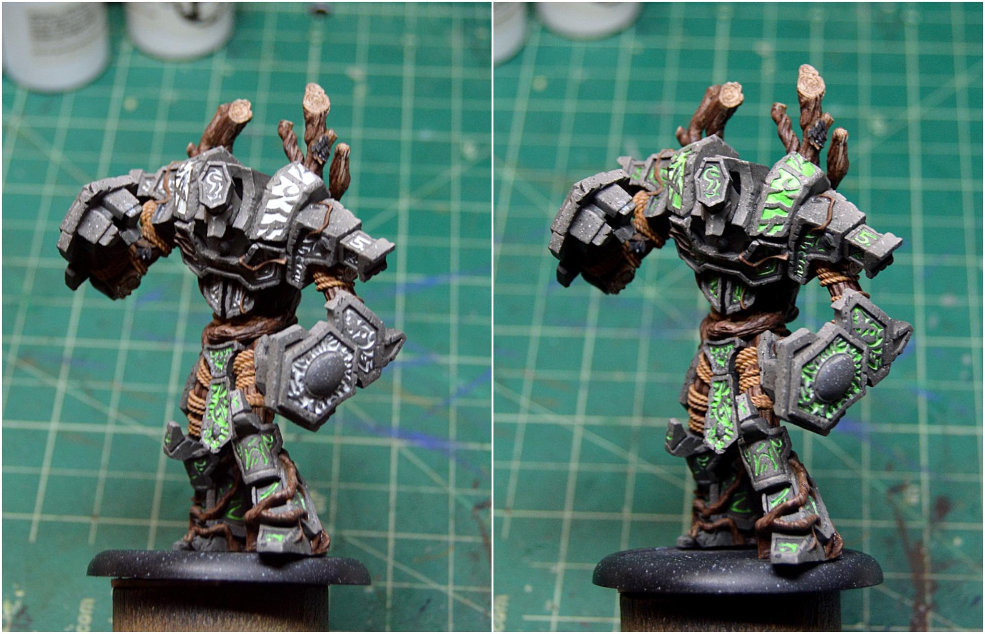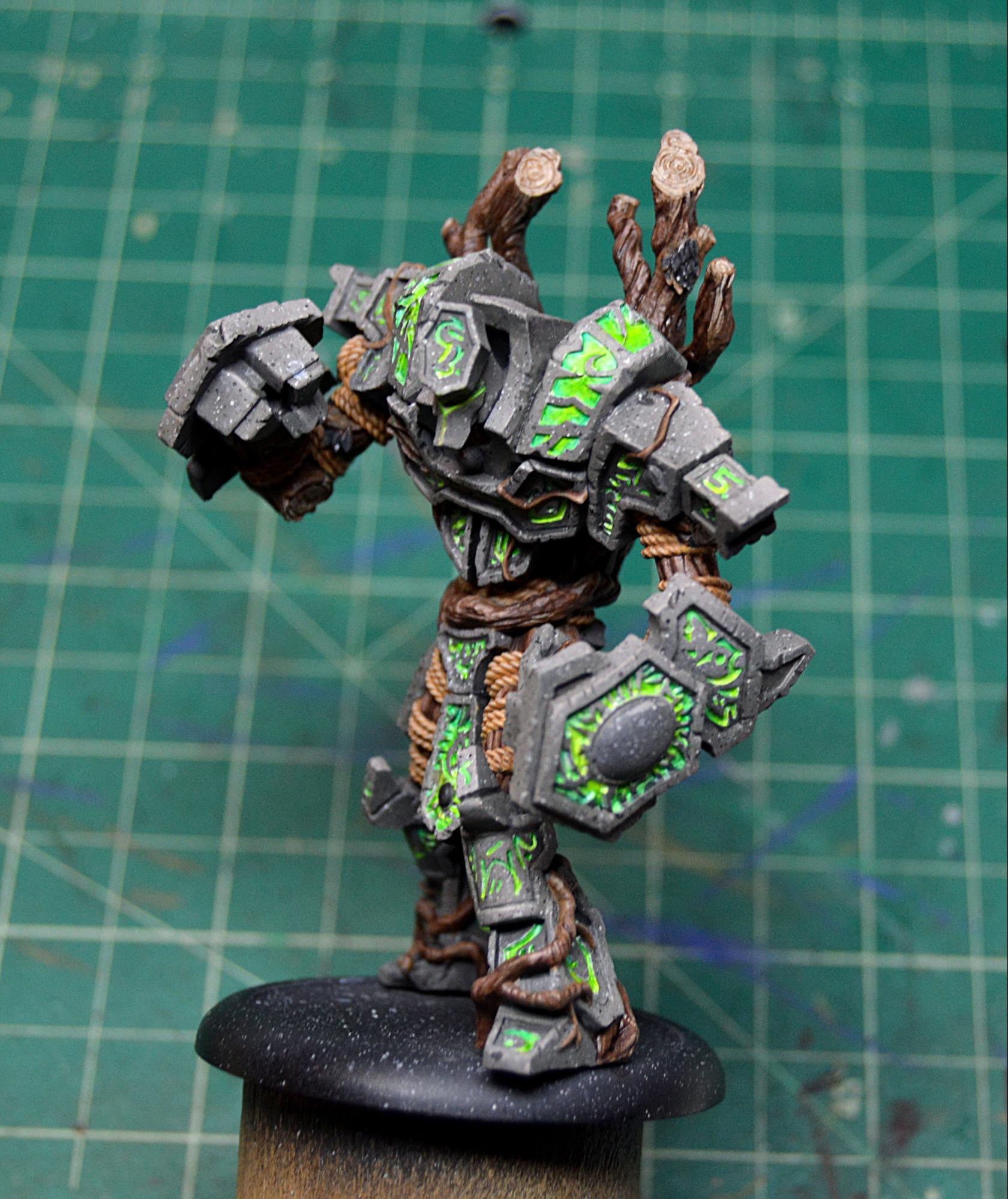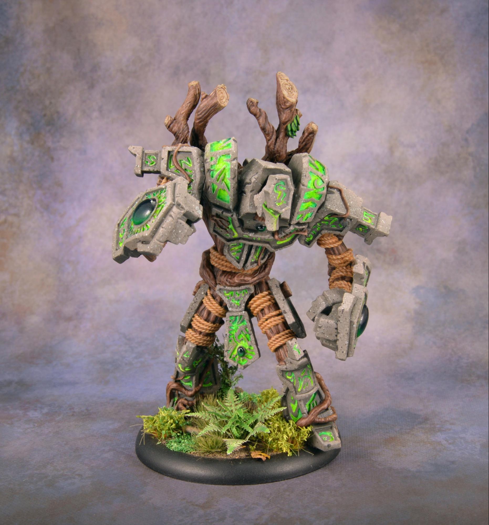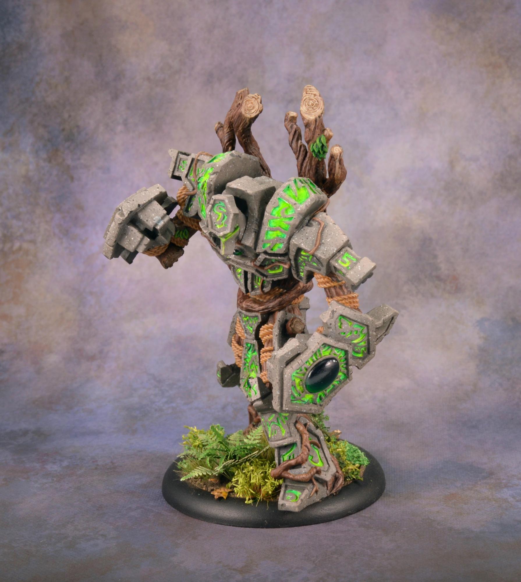 To finish off the model, I painted in the few bunches of leaves and touched up the stone where any of my glow might have gotten a little carried away. I then sealed the model with Testors Dullcote to kill any shiny spots of the inks on the wood and on the glow and to help protect it, as I’m sure it will be finding its way onto the table soon. Once that was completely dry, I took an old brush and some paint on gloss varnish to give the gems a good coat for an extra dose of realism. I finally based Megalith with a bunch of forest foliage, including some ivy and a fern, and it’s all done!