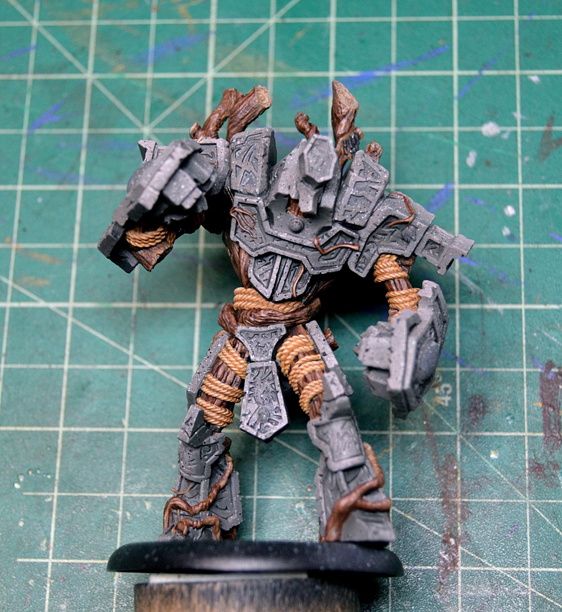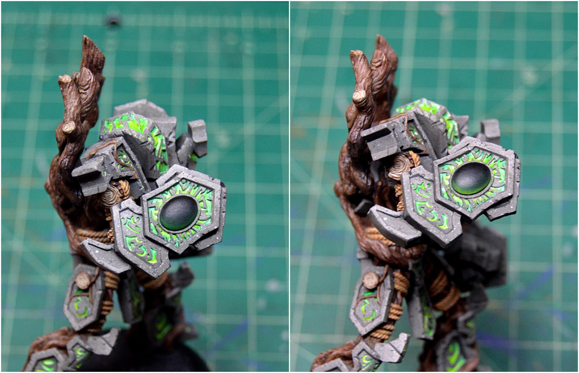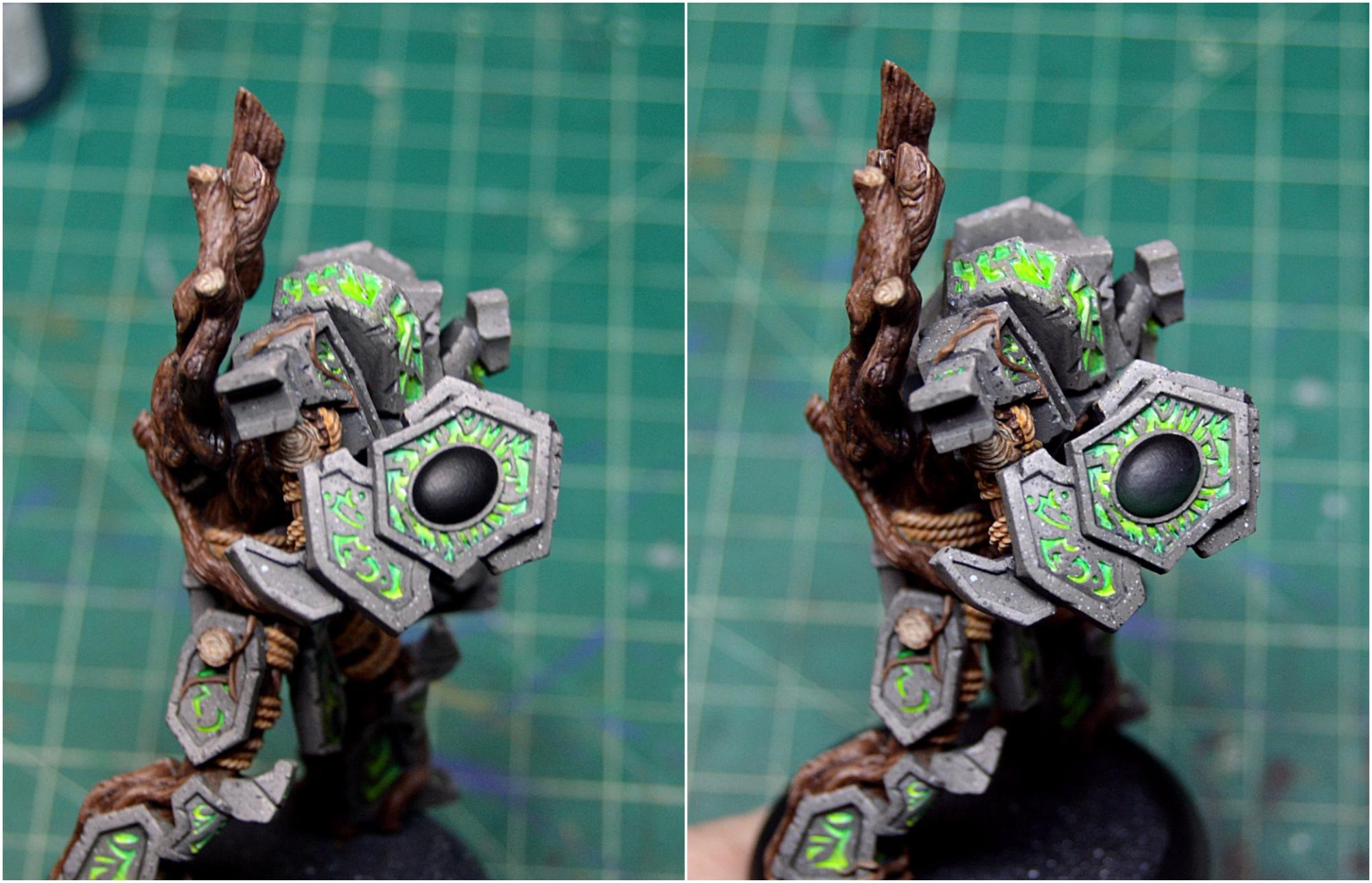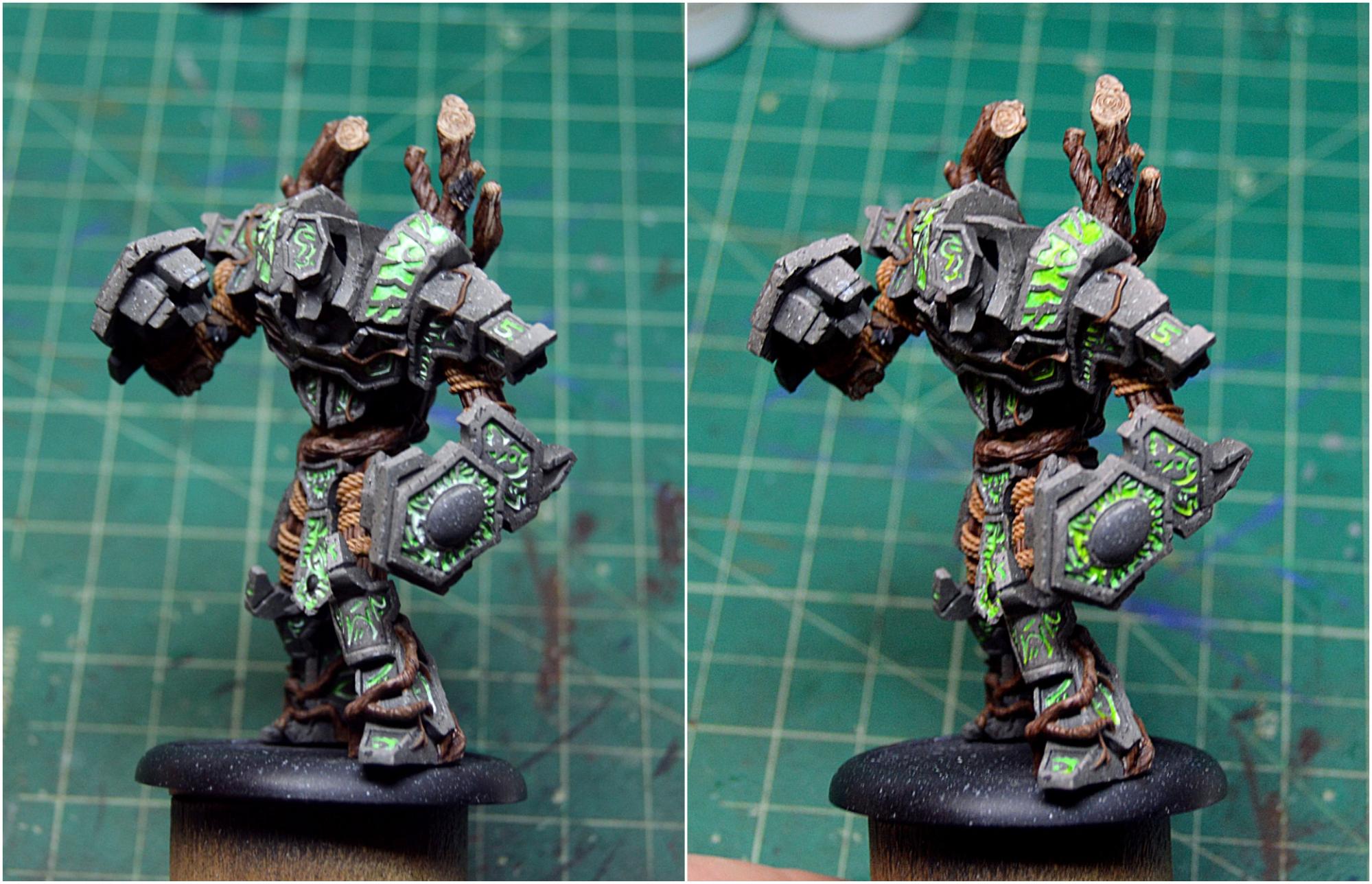 To finish off the model, I painted in the few bunches of leaves and touched up the stone where any of my glow might have gotten a little carried away. I then sealed the model with Testors Dullcote to kill any shiny spots of the inks on the wood and on the glow and to help protect it, as I’m sure it will be finding its way onto the table soon. Once that was completely dry, I took an old brush and some paint on gloss varnish to give the gems a good coat for an extra dose of realism. I finally based Megalith with a bunch of forest foliage, including some ivy and a fern, and it’s all done!