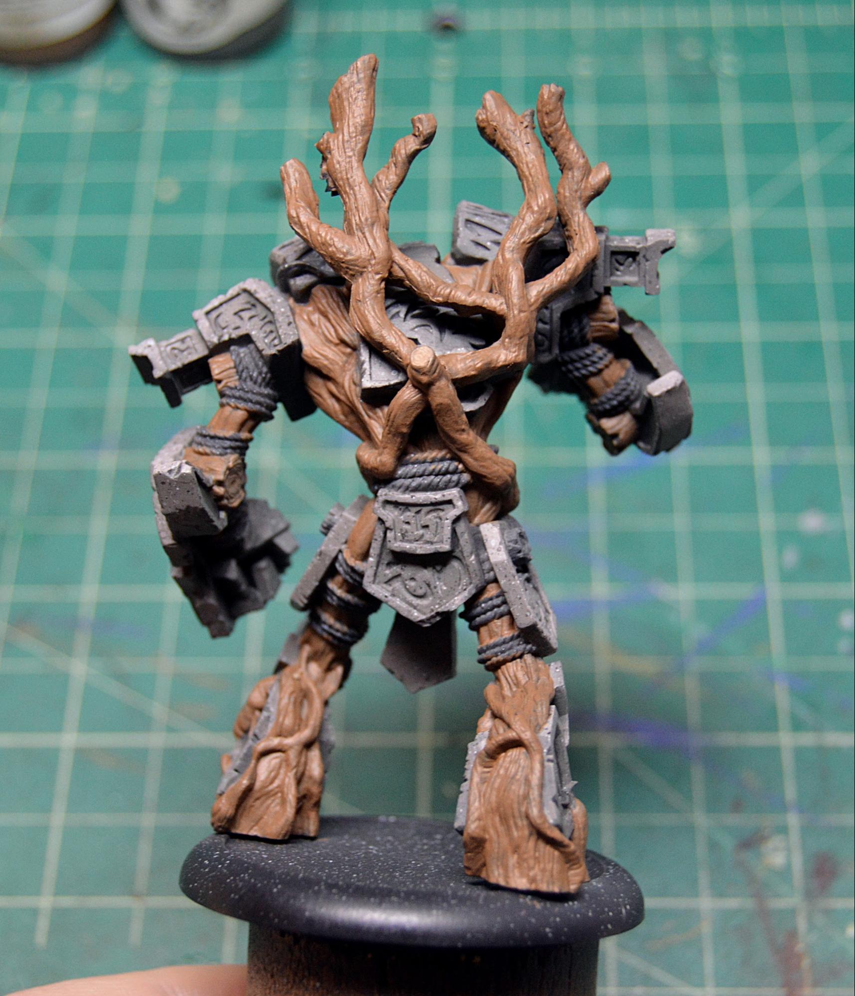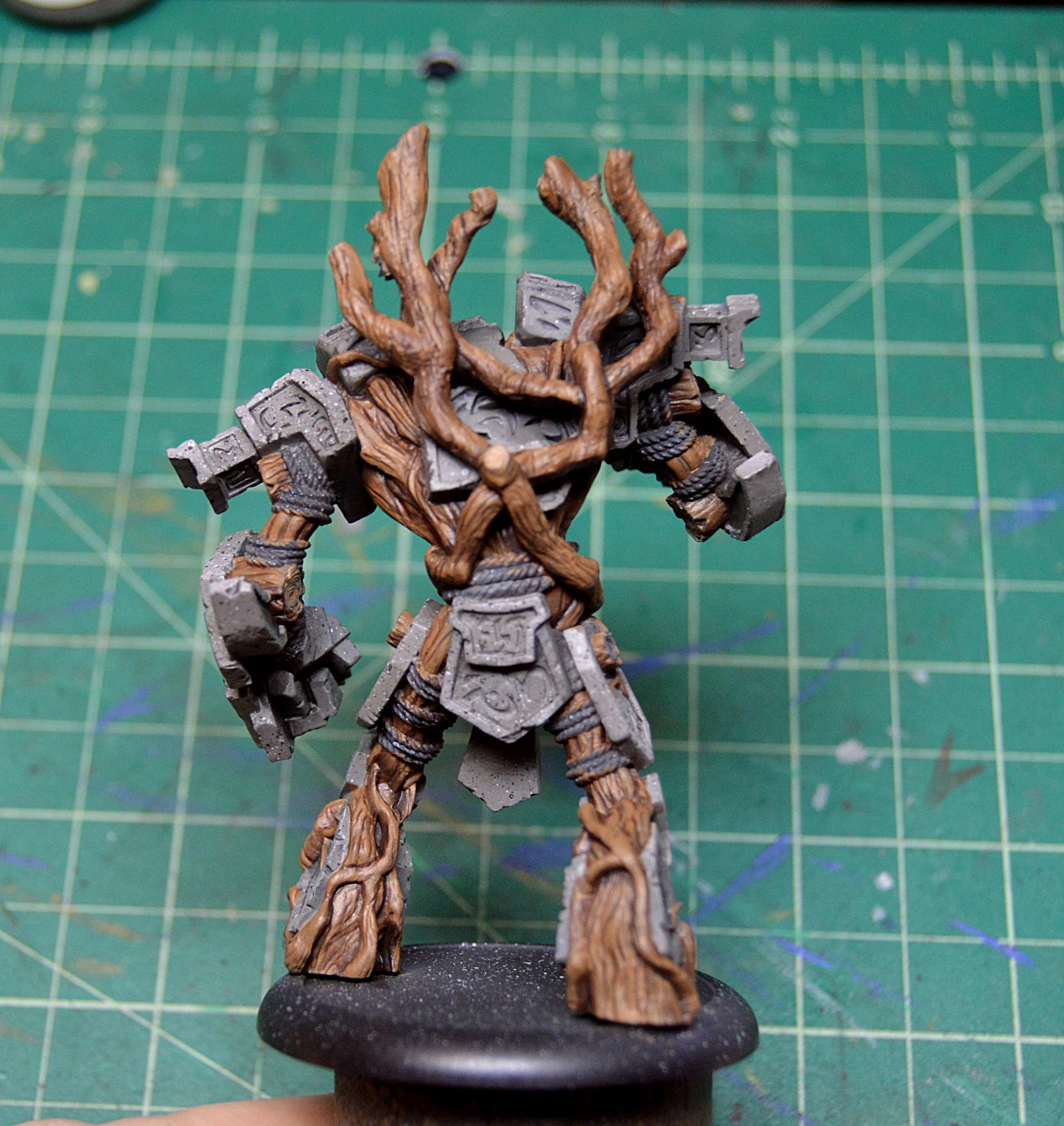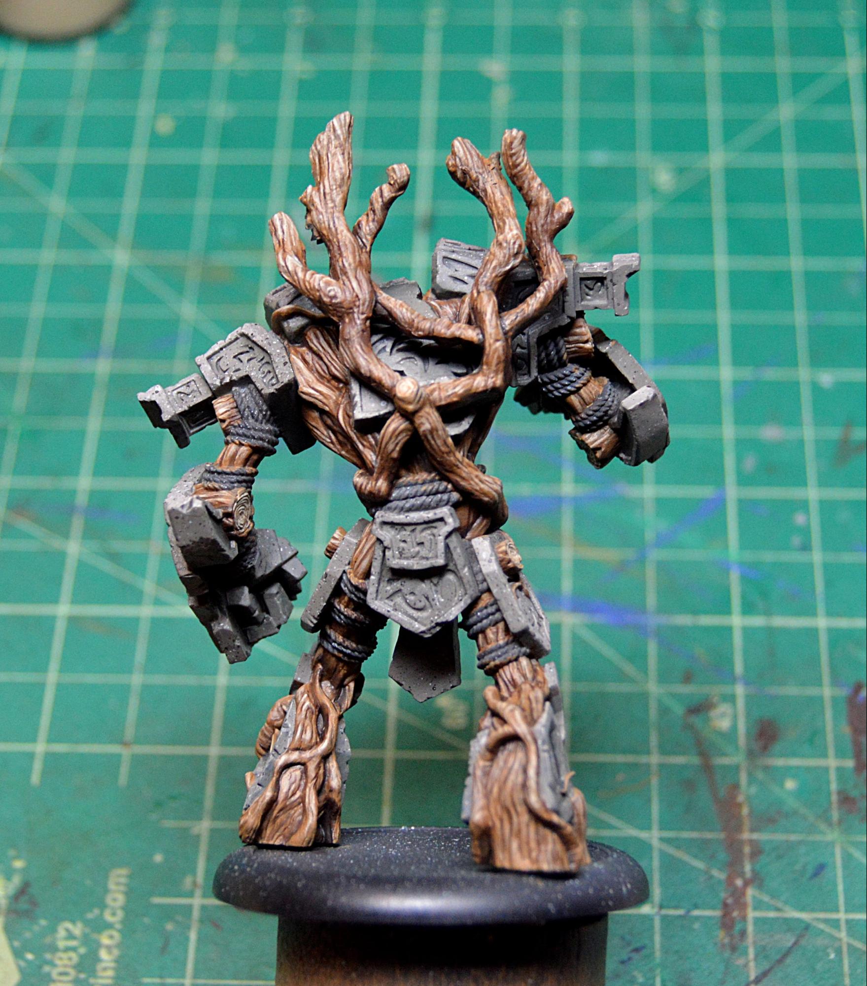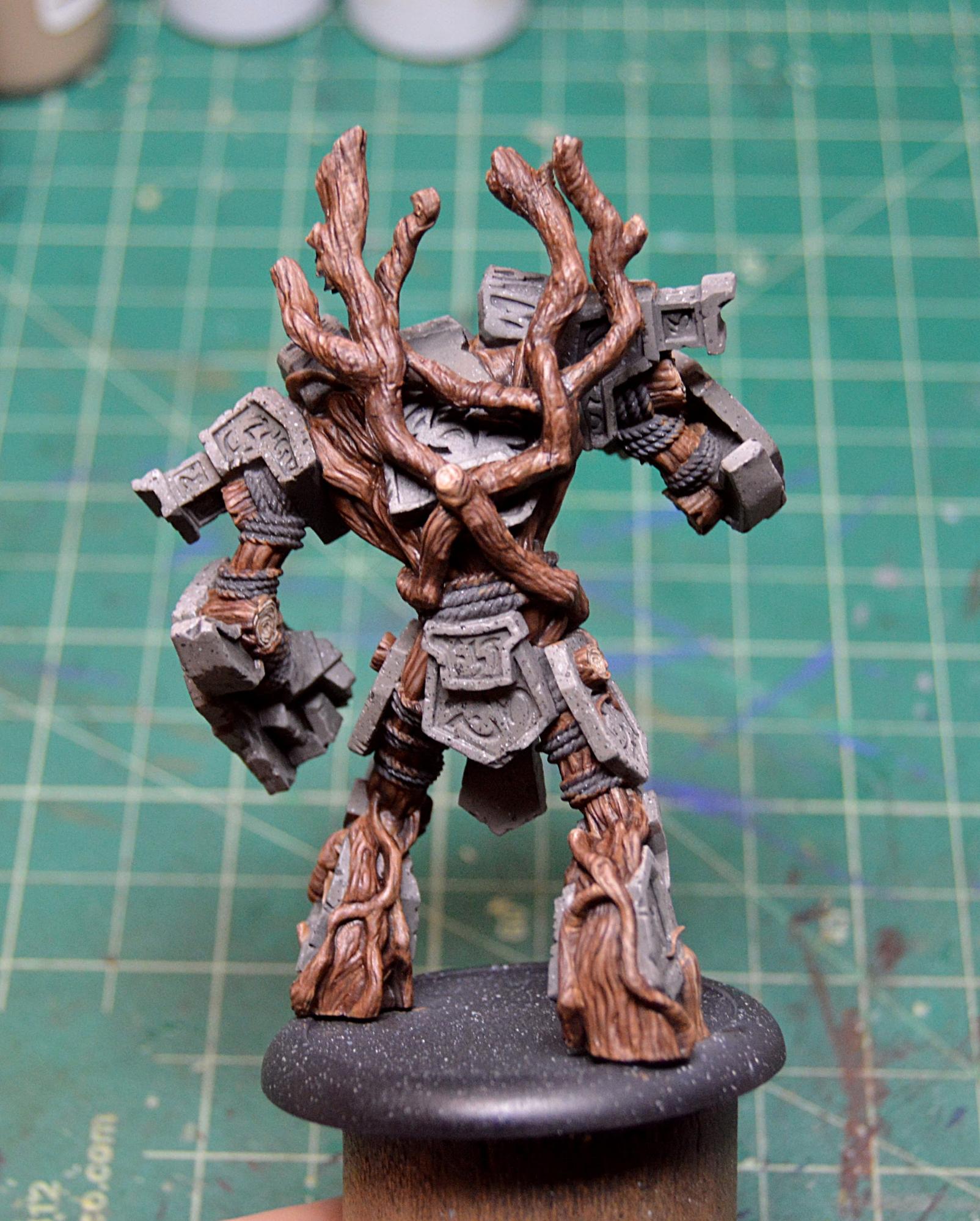 To finish off the model, I painted in the few bunches of leaves and touched up the stone where any of my glow might have gotten a little carried away. I then sealed the model with Testors Dullcote to kill any shiny spots of the inks on the wood and on the glow and to help protect it, as I’m sure it will be finding its way onto the table soon. Once that was completely dry, I took an old brush and some paint on gloss varnish to give the gems a good coat for an extra dose of realism. I finally based Megalith with a bunch of forest foliage, including some ivy and a fern, and it’s all done!