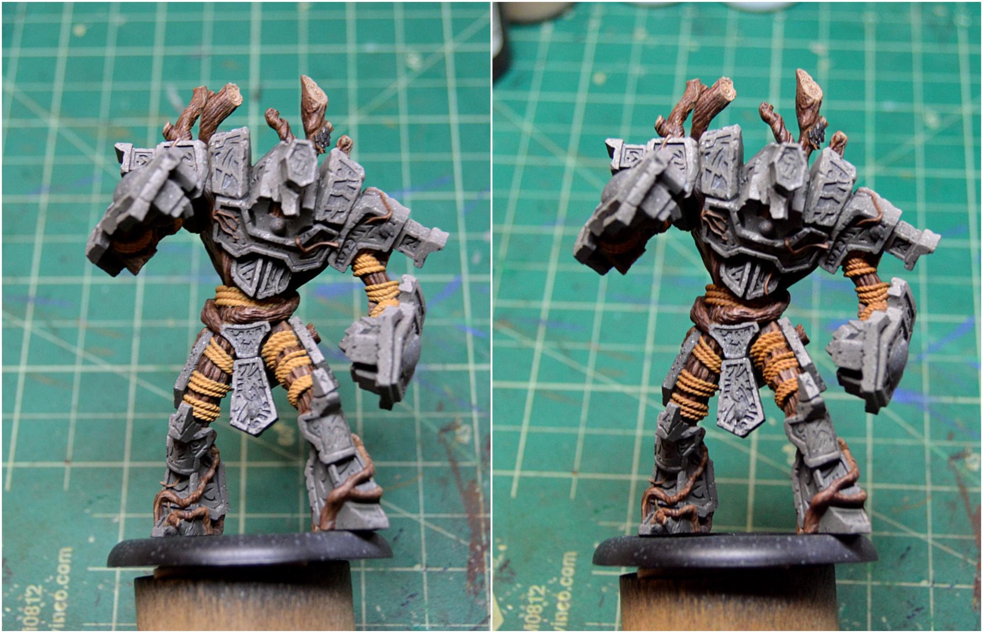 Highlight the wood by focusing on the texture of the wood grain and by painting the ridges with Hammerfall Khaki. For the highest highlights, use a mixture of 50/50 Hammerfall Khaki and ’Jack Bone with a little Menoth White Highlight added in. Focus this color on the upper branches as well as anywhere that would catch a significant amount of light. Go for a really high level of contrast, as the next step will tone down the colors significantly. Highlight the wood cores with the same mixture used for the highest highlights on the wood, focusing on accentuating the rings.