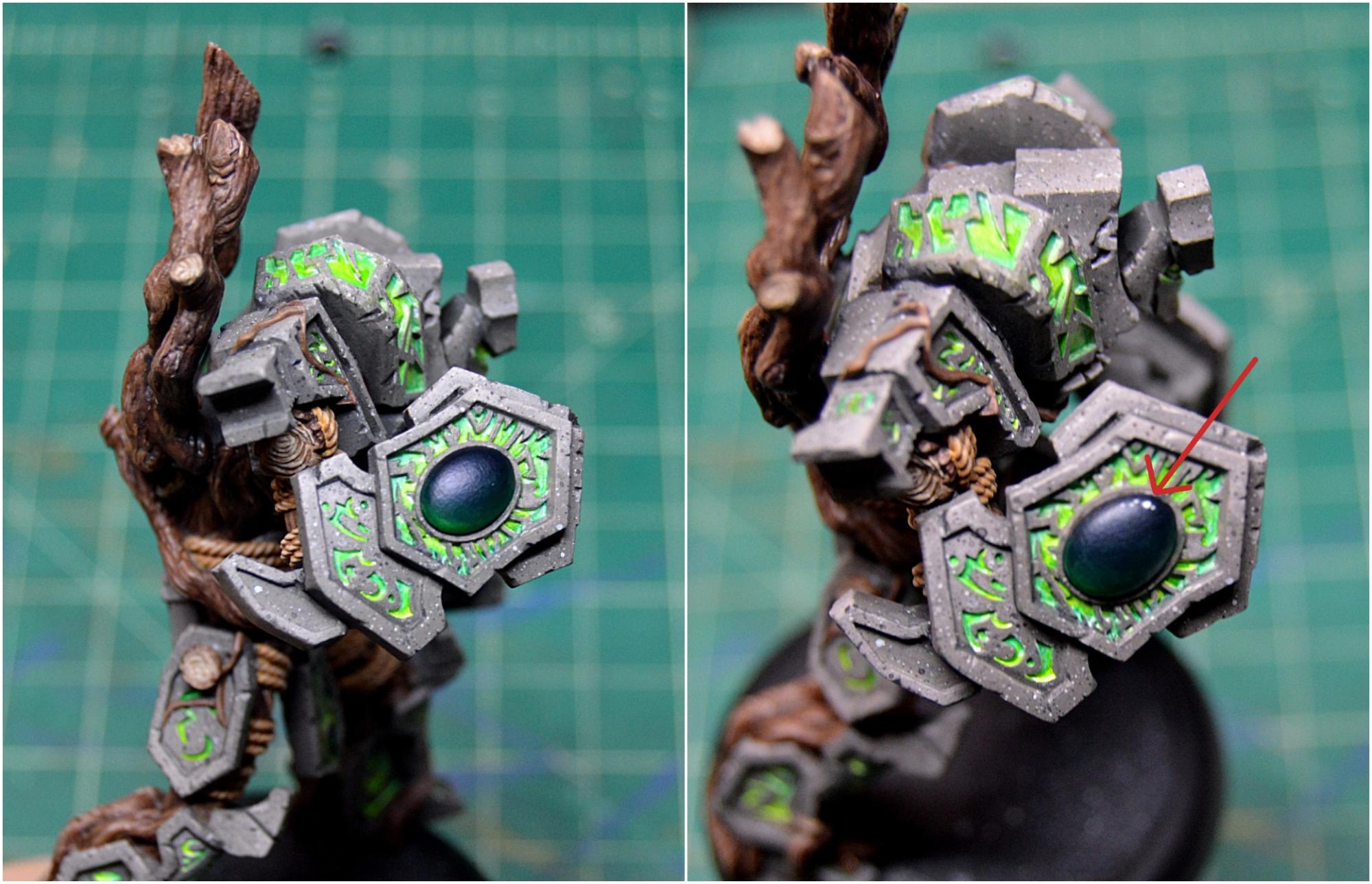 Next take some Green Ink and, in thin layers, glaze over the entire gem. Make sure to build up enough layers so that even the black appears to be a very deep green. Finally take a brush with a very fine point and use Menoth White Highlight to make a few reflective dots on the top of the gem. I’ve used a red arrow to point out where they should be as the glare from my painting lamp slightly overlaps.