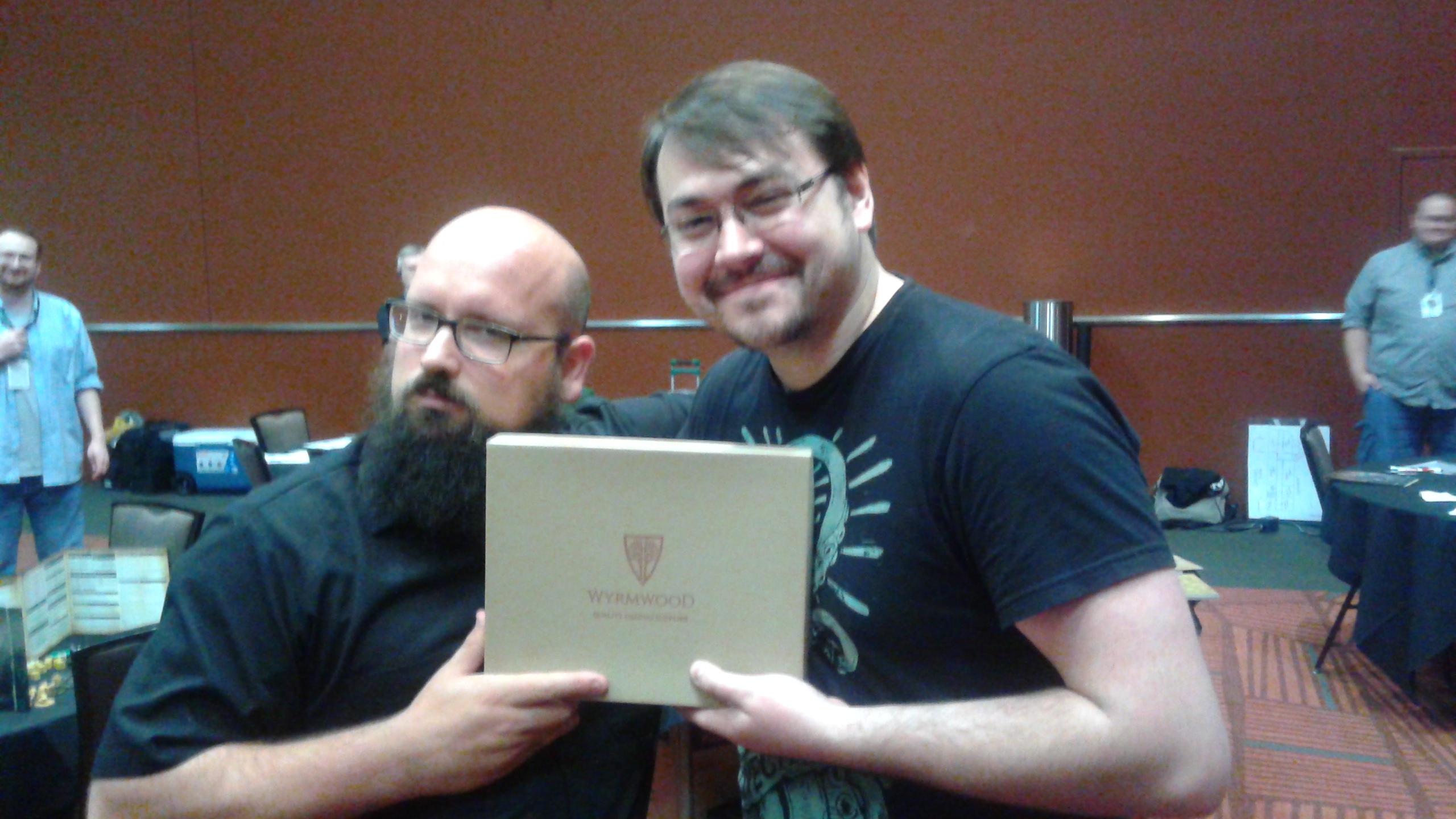 Despite all our meddling, the players had a great time and determined the champion. For the second year in a row, our Full Metal Game Master is Bryson Bullough. As his reward and to demonstrate his prowess, Bryson received a masterfully crafted Wyrmwood dice tray. This year’s was constructed from purple heartwood, a perfect complement to any Grymkin-themed adventure you might be playing…