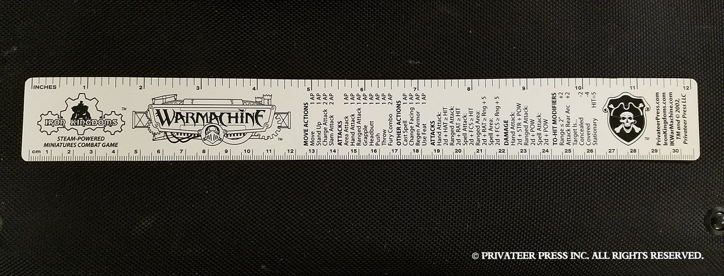 2002 saw the debut of WARMACHINE. Sorscha, Stryker, Kreoss, and Deneghra launched at the helm of our flagship game, and thousands of models went home with journeyman commanders eager to take the fight to their brand-new opponents. Each battlebox came with this awesome ruler, complete with the AP listing for various power attacks and actions. The game has evolved quite a bit since then.