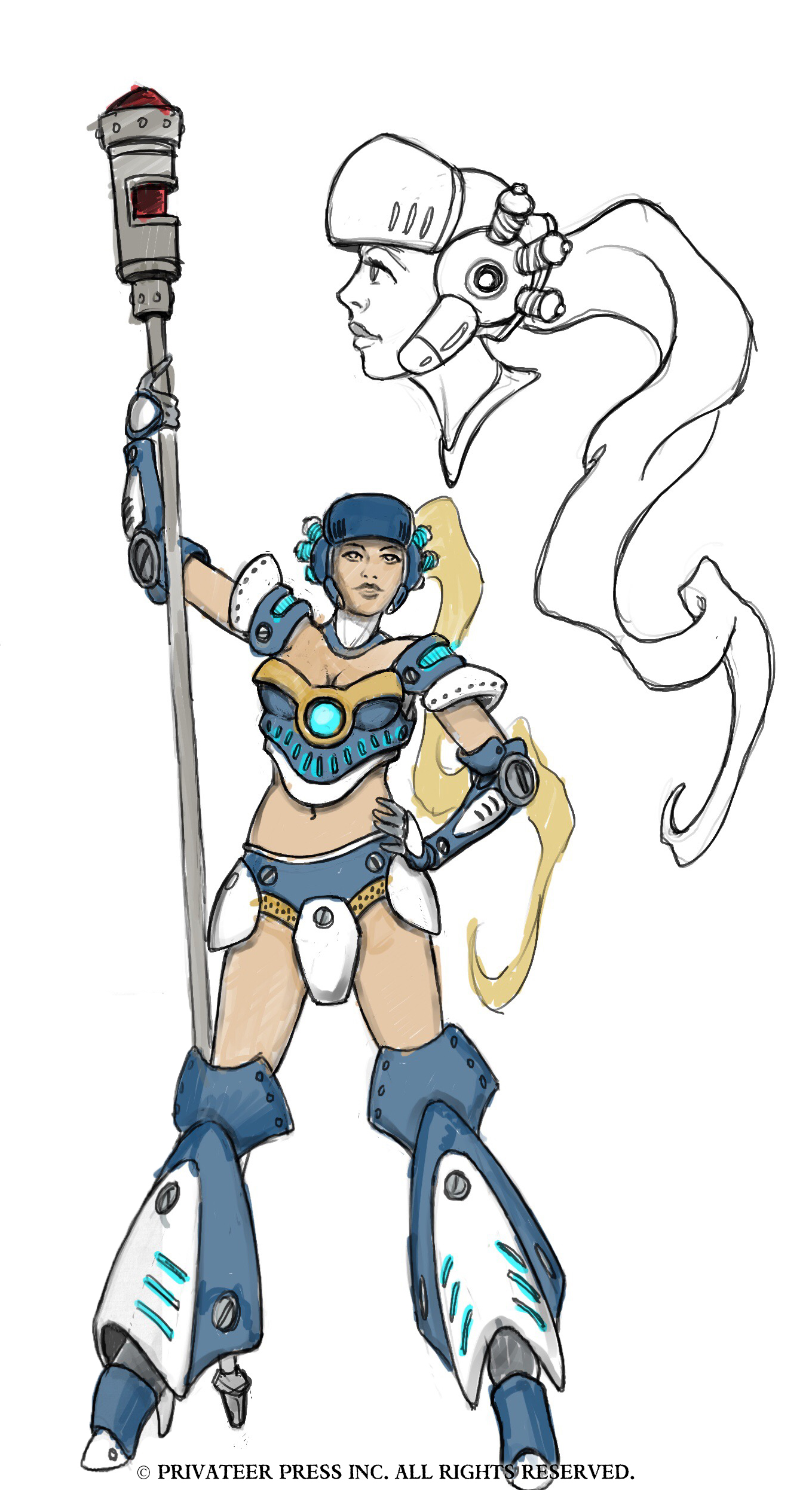 What resulted was a sort of deconstruction of the little automaton and its reassembly into the armor of a gallant heroine. All of the elements present in the design of the new character can be traced back to the design of the squire—from the cyclopean optic lens to the flared-out legs (to the old guy doing the art). Even the staff hearkens back to the asymmetrical targeting scope on the original Squire.