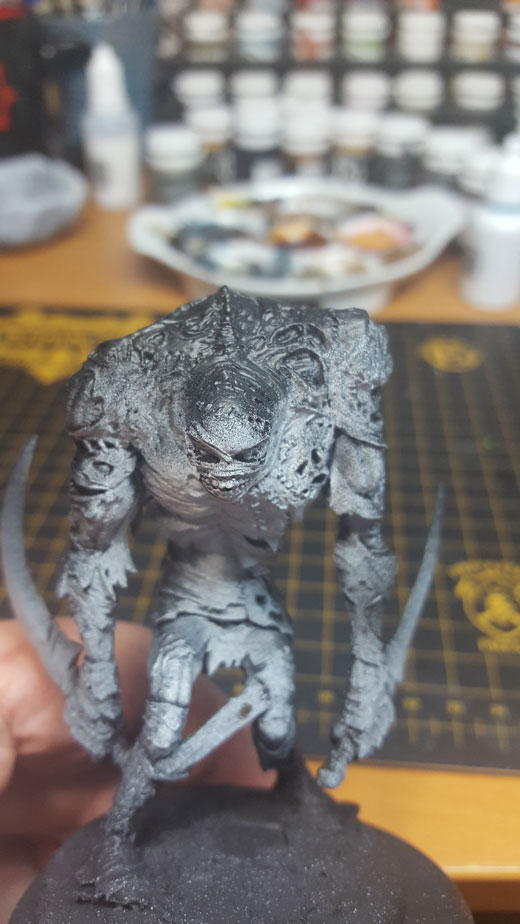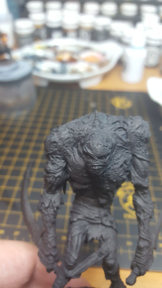 First, I cleaned, prepped, and primed my model normally. I used Formula P3 Black Primer, as this give me a nice starting point for my shadow.