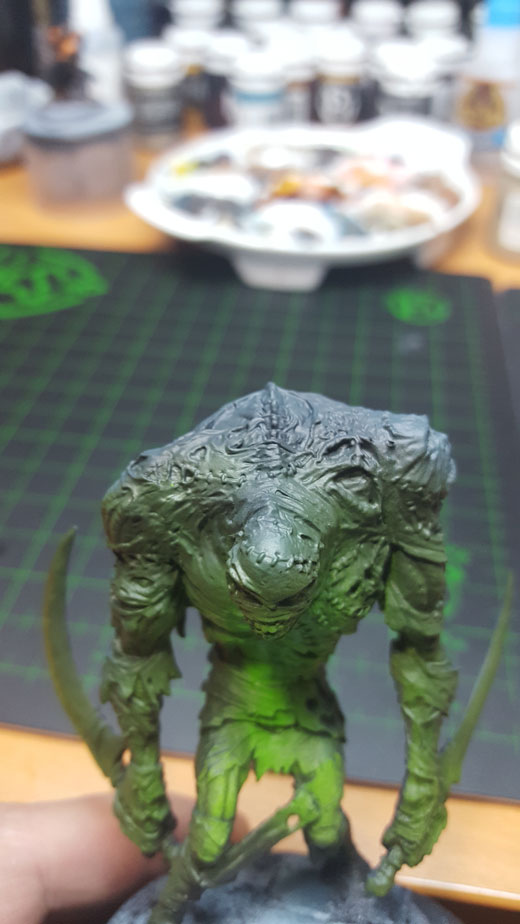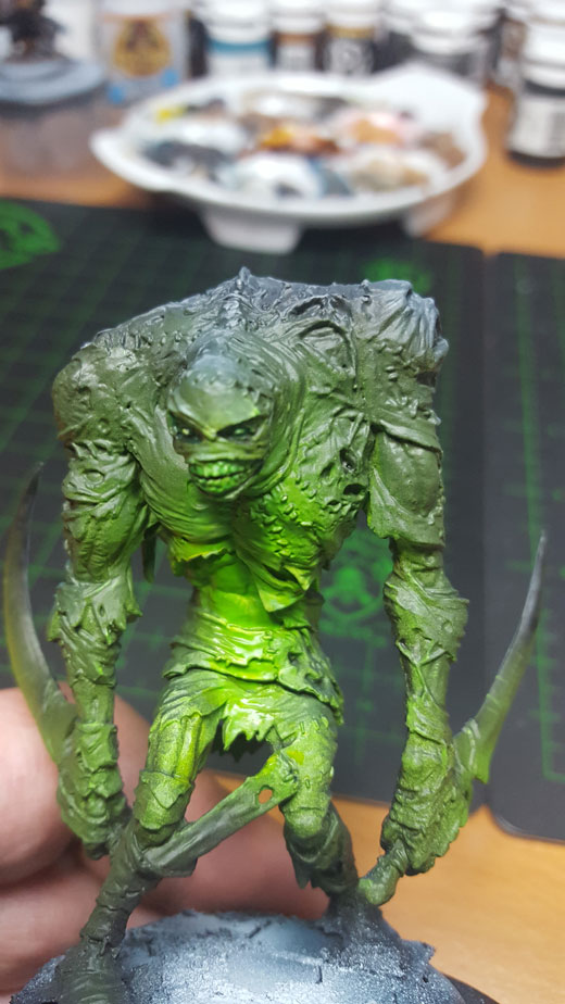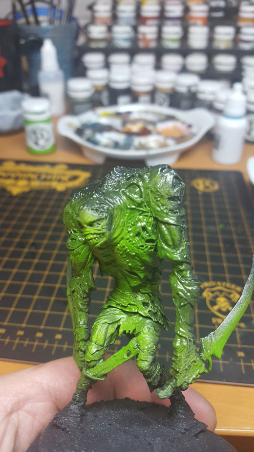 Then, I mixed roughly 50/50 Necrotite Green and Morrow White and used it to add some highlights to the green. I used Underbelly Blue to add highlights to the edges of the “shadow” zones.