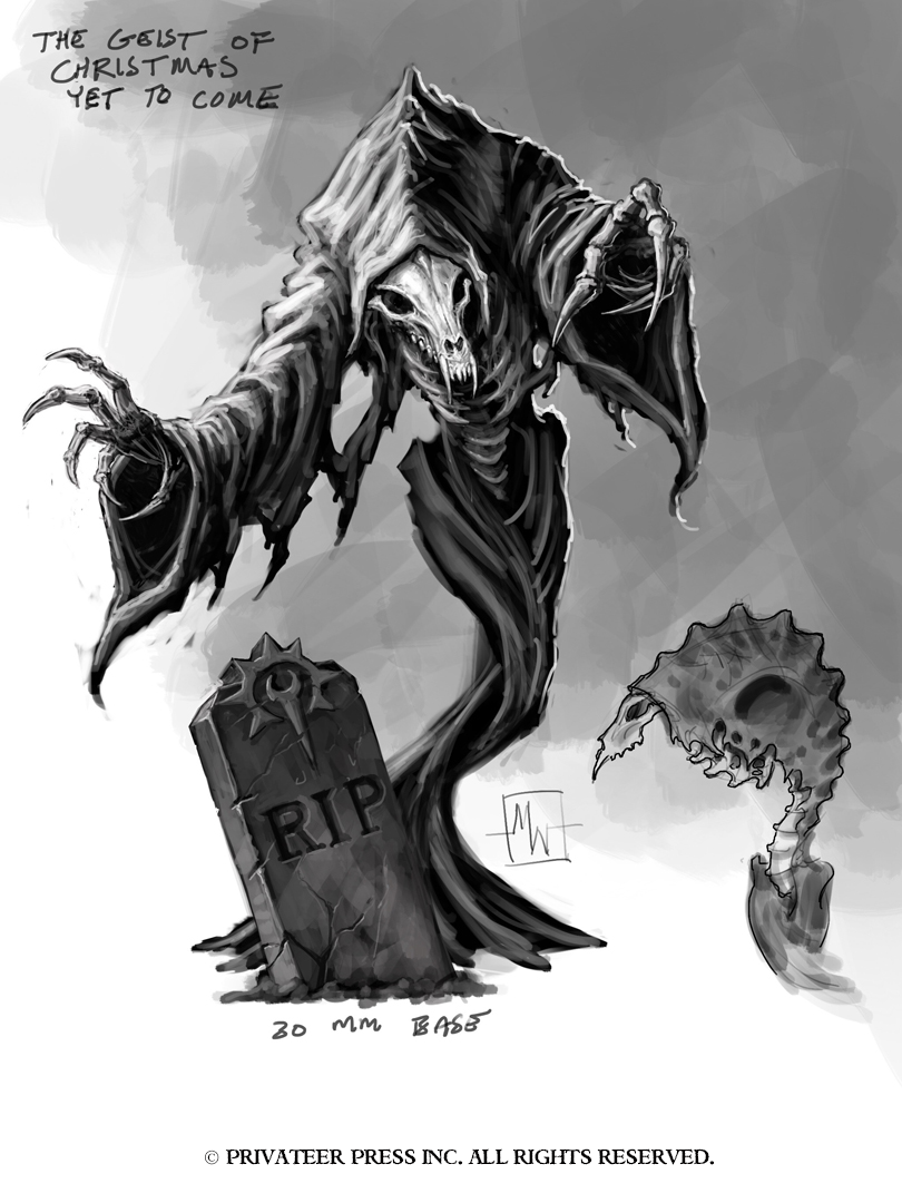 Based on the original Feral Geist miniature from HORDES, the Geist of Christmas Yet to Come is a horror rising from the grave to show you the error of your ways in games you’ve not yet played…and perhaps to claim your dice in the process. It’s an excellent blend of classic death imagery and the beasties that live in the wilds of the Iron Kingdoms.