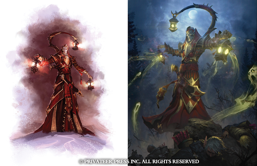 Aside from the image dimensions issue, the older art often lacked action and featured only minimal background. The legacy artwork nearly always placed the Faction within their native environments. Knowing that each of the Factions typically has some of its forces on the move, I wanted to start branching out into other locations in the setting and seeing the Skorne, for example, encounter WARMACHINE Factions. In the case of the Venator Reivers, I wanted a little tongue-in-cheek nod to the Retribution forces book where it seems every illustration has the forest on fire. The idea is that they’re over the Iosan peaks and have begun moving into the woods. Atmosphere in an illustration can go a long way, and those burning embers floating across the shot also helps establish a foreground, middle ground, and background.