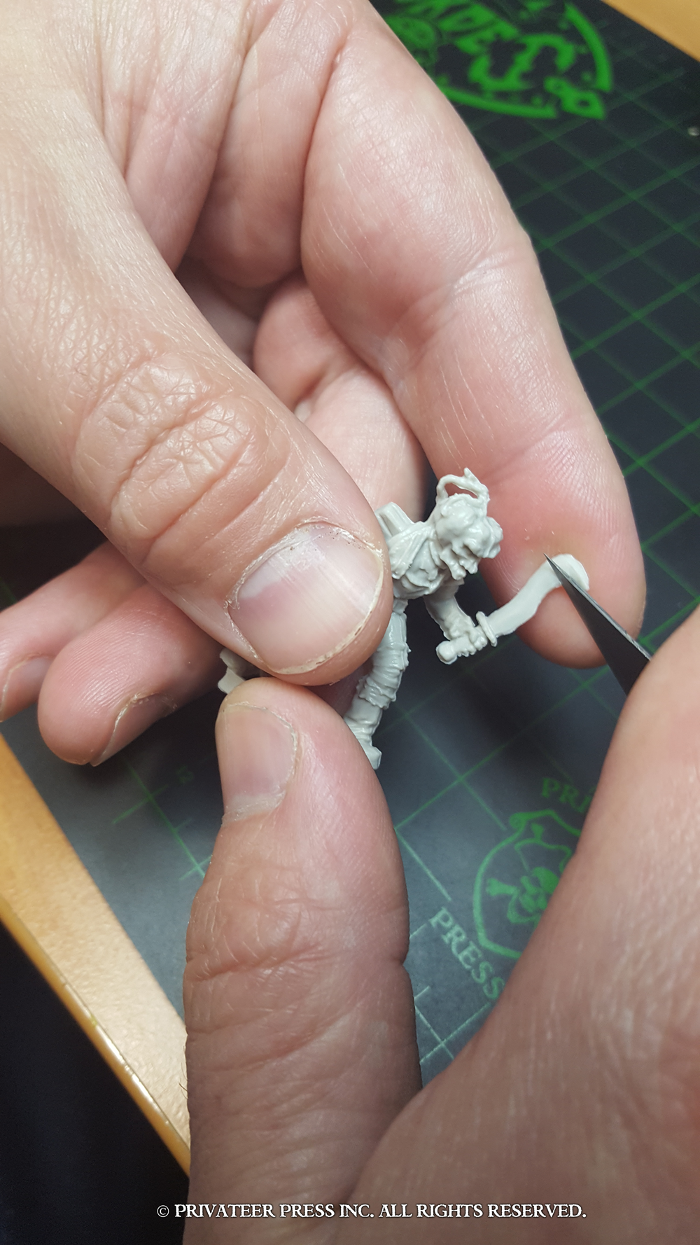 Even though they are not soft board game plastic, some plastic models have thin areas that can be tricky to clean. The Grymkin’s Dread Rots have thin weapons that can flex when you attempt to clean them. Use your thumb to hold the piece in place and very carefully and gently slide a new hobby knife along the mold line. Once again, if you are getting resistance, you are cutting too deeply. The knife should remove the material easily with no fuss.
