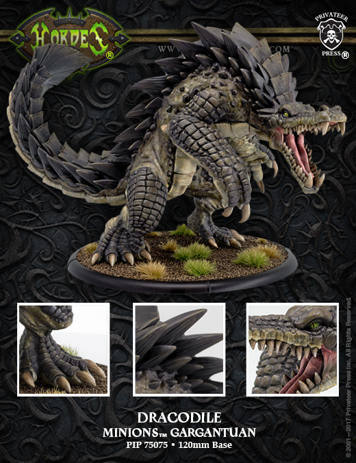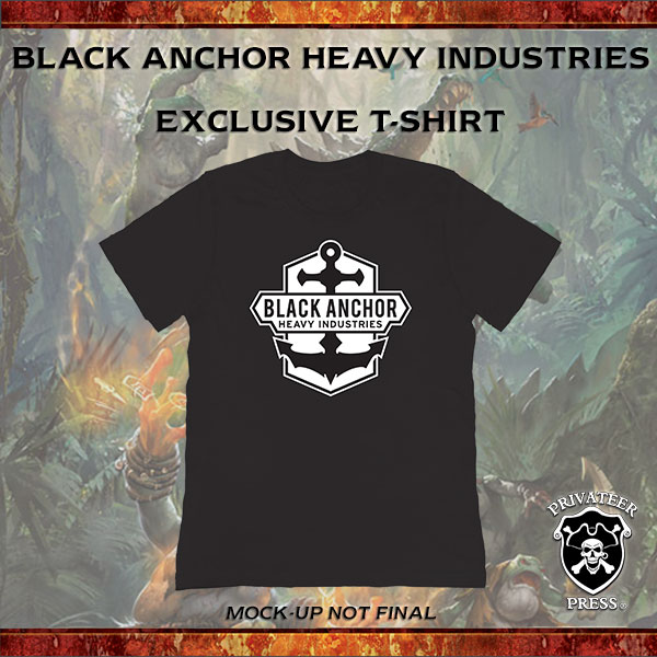 The first offering from Black Anchor Heavy Industries is the long-awaited, much-demanded Dracodile gargantuan. The Dracodile has only recently completed testing in CID, and don’t forget it not only works in a gatormen army but also in a Skorne one. (Desert-Themed Dracodile, anyone?) As of today, the Dracodile is available for preorder HERE, and anyone preordering by the December 1st cutoff date will receive an exclusive Black Anchor Heavy Industries T-shirt. Preorders will ship by December 15th, just in time to put under the Christmas tree, if you’re thinking of the ultimate gift for your favorite Blindwater or Skorne player (or maybe for yourself)! Unfortunately, preorders will be limited to the first 1,000 orders in order for us to guarantee holiday delivery, so don’t delay if you want yours sooner rather than later. But the Dracodile will be available through the Privateer Press Online Store as a normal item after December 15th, so don’t despair if you miss the window.