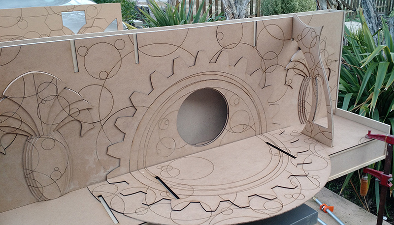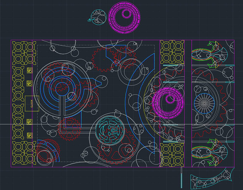 The LVO 2016’s table was a Convergence of Cyriss-themed board. (The complete tutorial can be found here.) Again, this table started off with some CAD design. Despite all appearances, I tend to wing these projects quite a bit, probably due to the fact that I usually end up waiting until 3–4 weeks before the event to even start them….