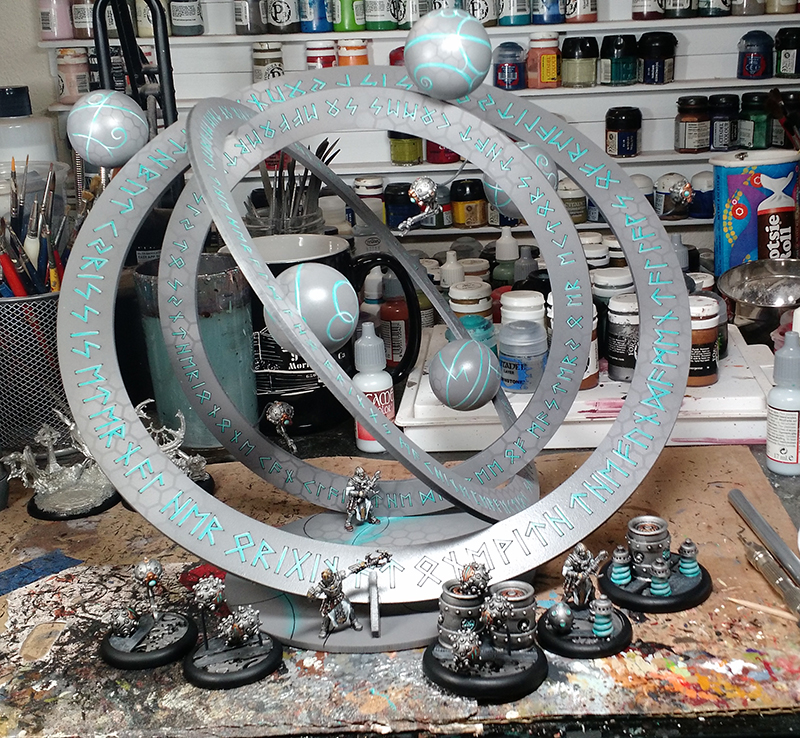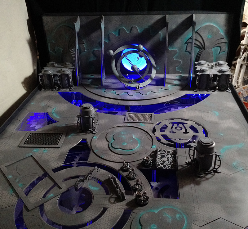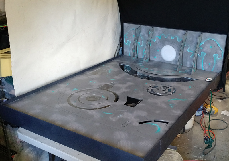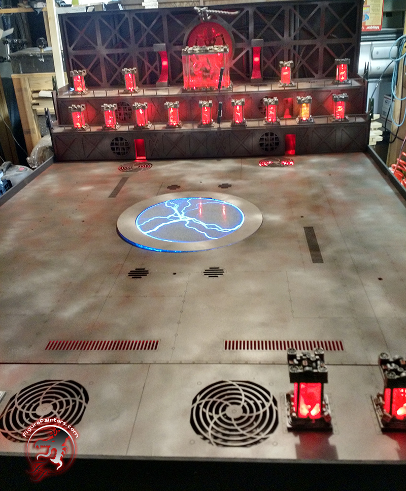 Fast-forward a little more, and the table is painted, and the bio-pods are attached to it. The center disk is one of those lightning panels that will follow your fingers around when you touch it. If you happen to have a metal model on it and you touch it, the lightning will follow the model, which is pretty cool!