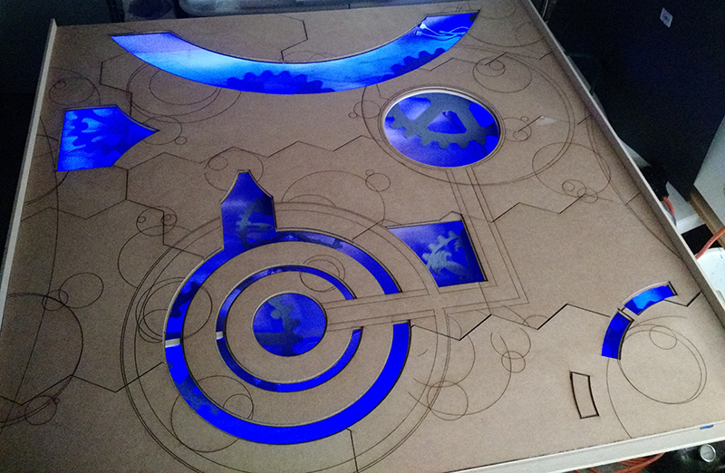 For the centerboard, I created rotating gears that are visible, in part, through clear panels. The inside is lit with LED strip lights, which can change to any color just by using a remote. Usually, I set the LEDs to slowly rotate through its entire color range, though, if a player is being particularly difficult, I can always put them on a quick flashing “seizure mode.”