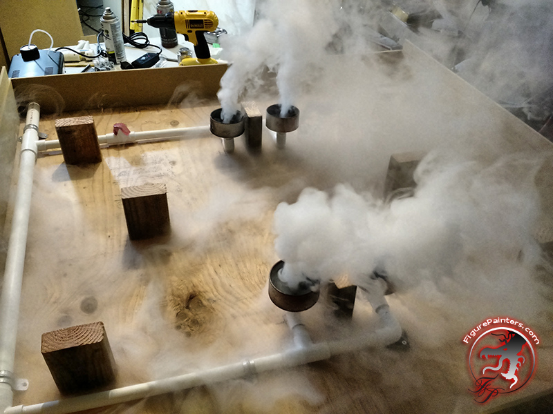 I planned to have smoke coming out of the board, so I built a small PVC pipe network to disperse the smoke from a machine hidden in the sideboard.