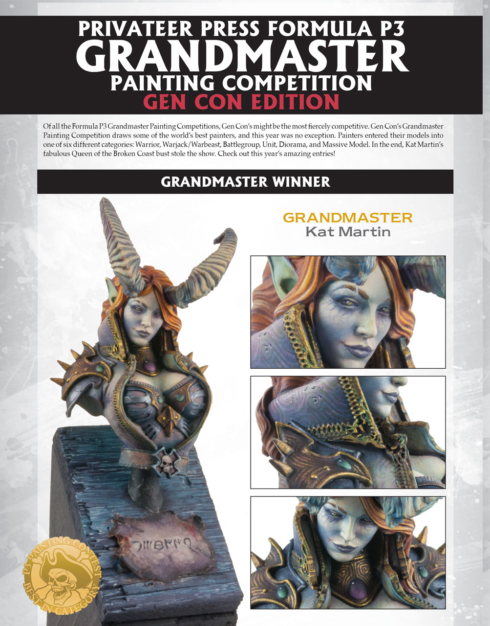 Description: Show off your painting skills at the annual Privateer Press Formula P3 Grandmaster Painting Competition. Privateer Press Studio staff will judge the pieces based on their individual merit, irrespective of the other entries and categories. Judges will look at each piece and may award gold, silver, or bronze, based solely on the quality of the entry. In addition, one entry will be awarded best overall, earning its painter the coveted title of Grandmaster.