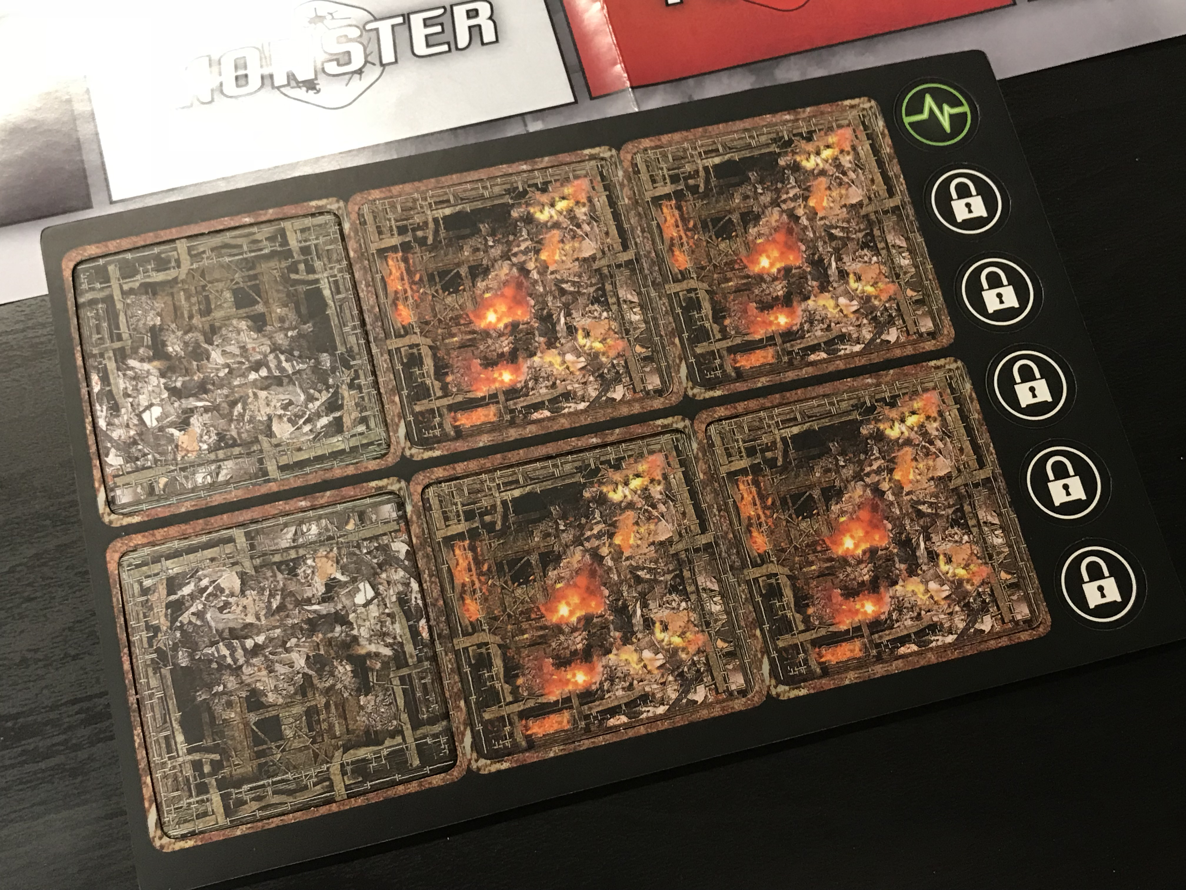 Alongside the buildings, you’ll get two token sheets containing 12 double-sided rubble/fire markers, 10 numbered building secured tokens, and two monster health-tracking tokens. Now the mathematically minded among you may be saying, Wait—there are only 6 apartment buildings in the box. Well we’ve put a dozen rubble/fire tokens in the starters because you can take up to twelve buildings when constructing your Monsterpocalypse army. Now you’ll be fully prepared for when the resin building packs come out!