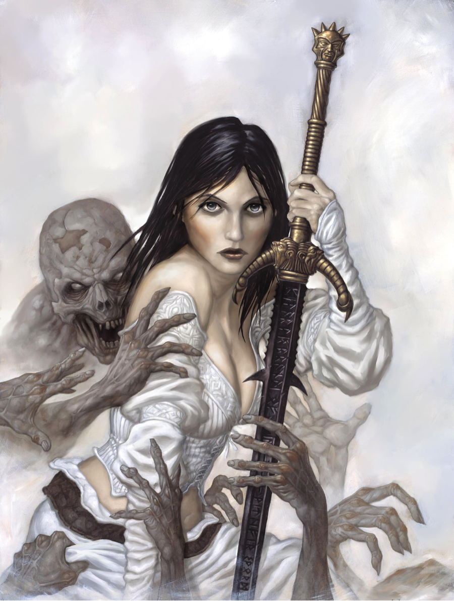 The basic description for this model was that we wanted to use the Witchfire cover art illustration as a template for the piece. After I sent the description to artist Andrea Uderzo with the appropriate reference material, he produced these sketches: