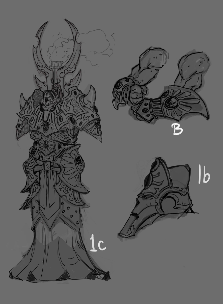 Johan provided me with some additional sketches, working in line with my original notes, and after meeting with Matt Wilson, I took the elements I liked the most and combined them to create 1b. This was moving much closer to what we were looking for, but wider hips were desired with the bracer designs of B. In addition, Matt requested that the head resemble the original Immortals and that we shift its head back and upward to help it feel more regal.