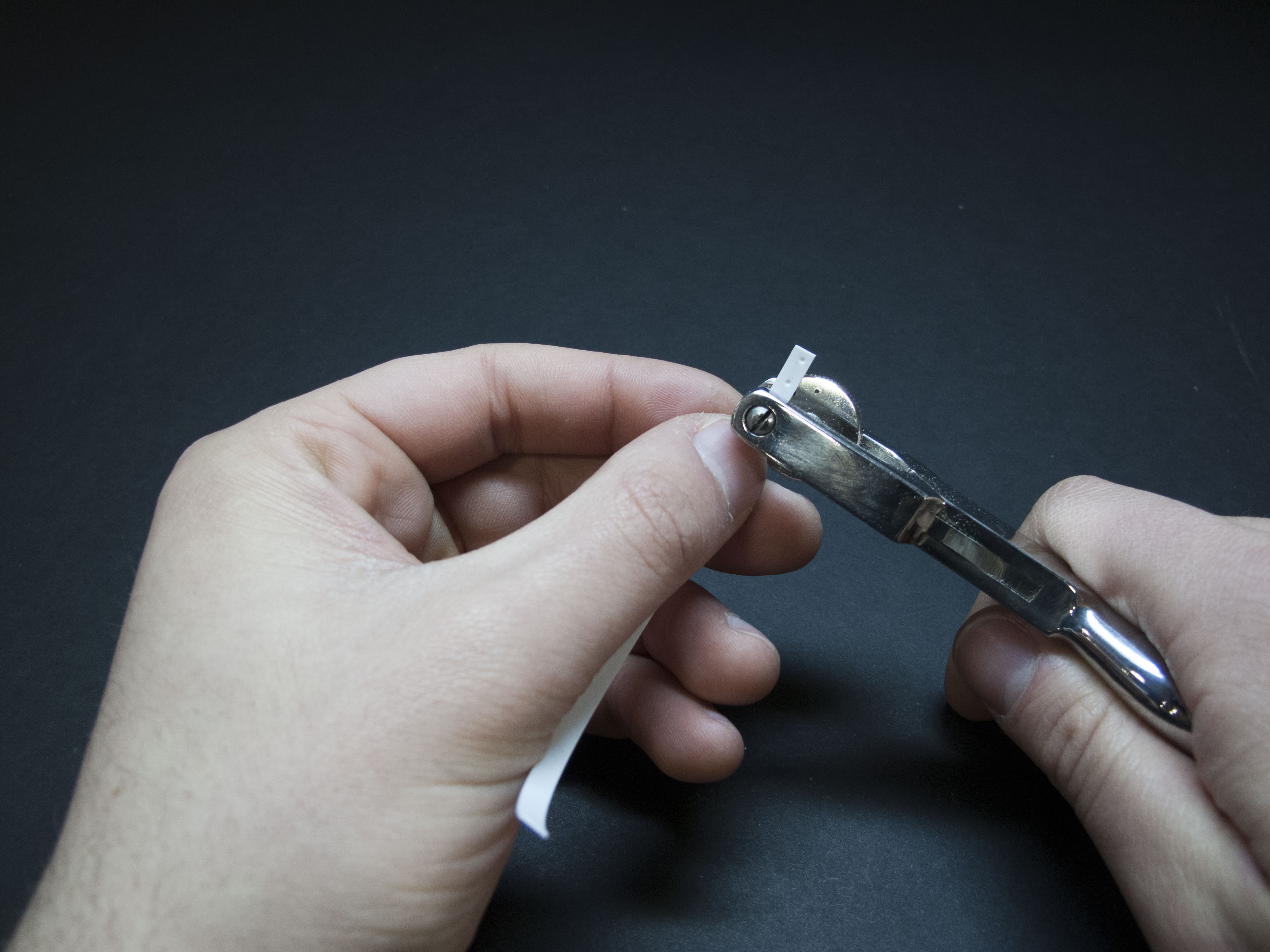 Gently press the punch into the back of the strip, taking care to not punch all the way through. This will emboss a rivet onto the other side of the strip. You can vary the size of those rivets by using the different sizes of holes on the wheel of your punch.