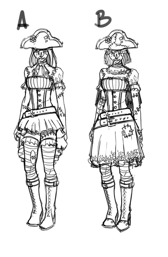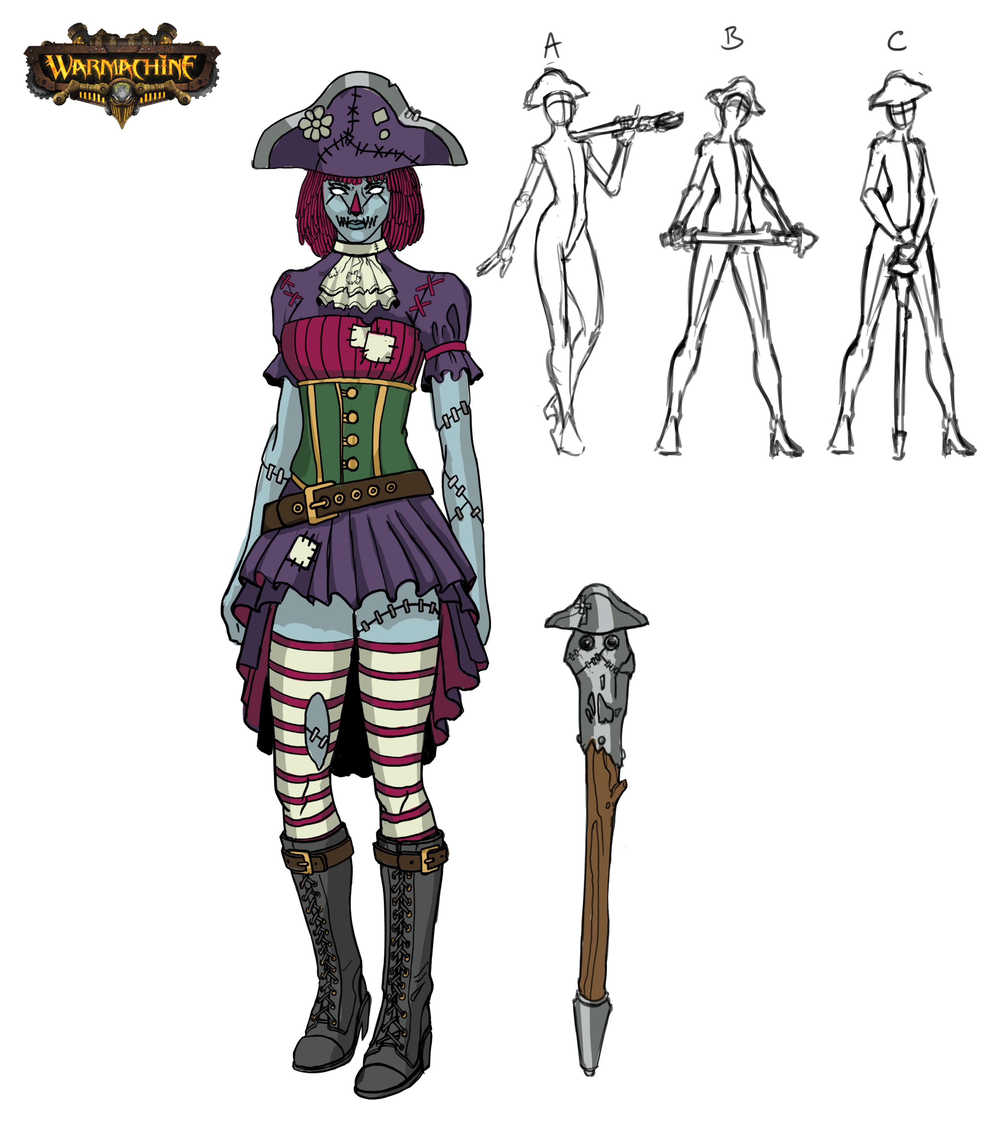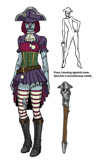 Option A was the winner, so all I had left to do was a quick color pass, sketch up her cane, and come up with some pose sketches.