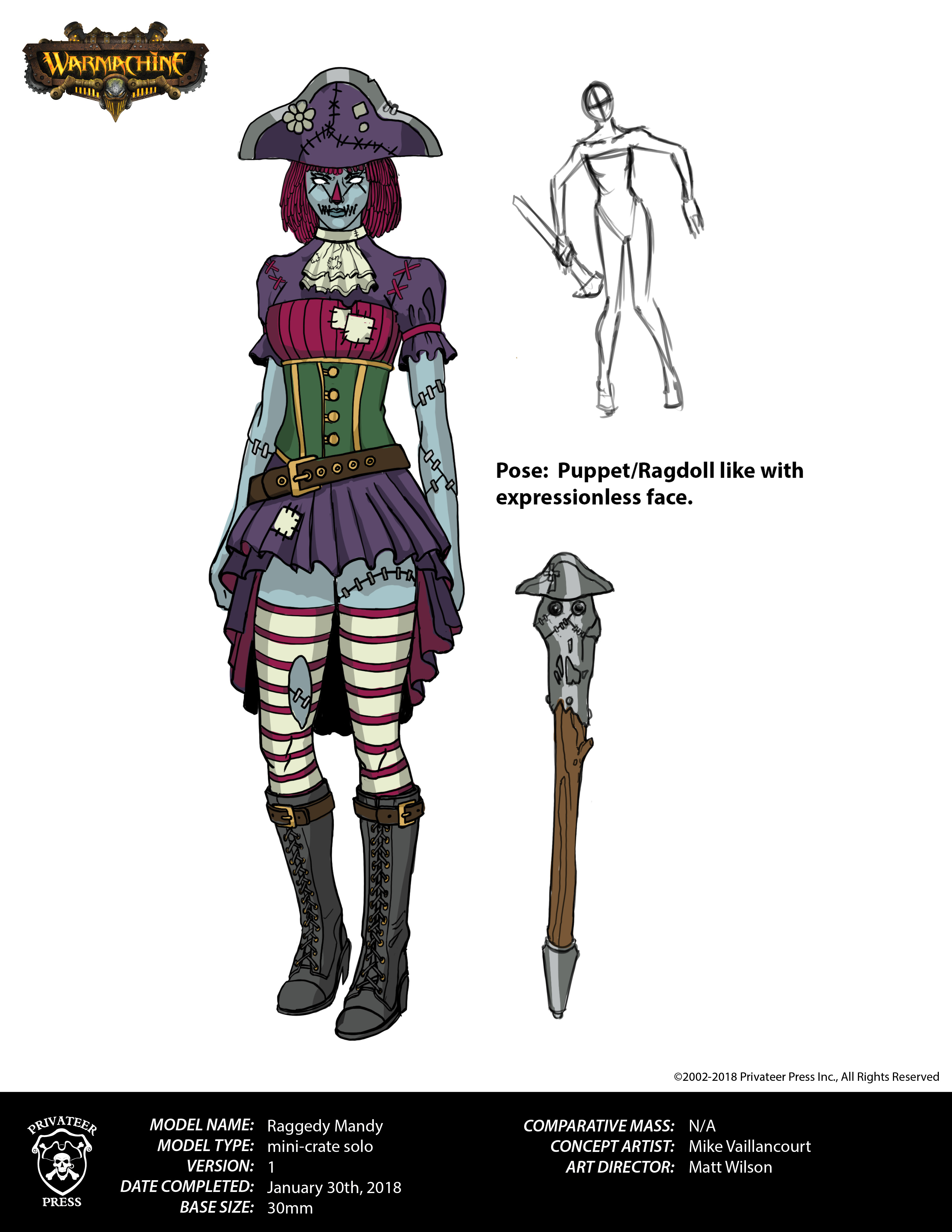 Hello, everyone, and happy New Year! For my first Insider of 2019, I’d like to tell you a bit about the concept art process for the MiniCrate exclusive model Raggedy Mandy. As an alternate model for the Ragman, the spin on this model was to turn her into a creepy doll with a nod to a toy that shares a similar-sounding name. Adding a little bit of a Victorian era spin, I worked up the following rough sketches.