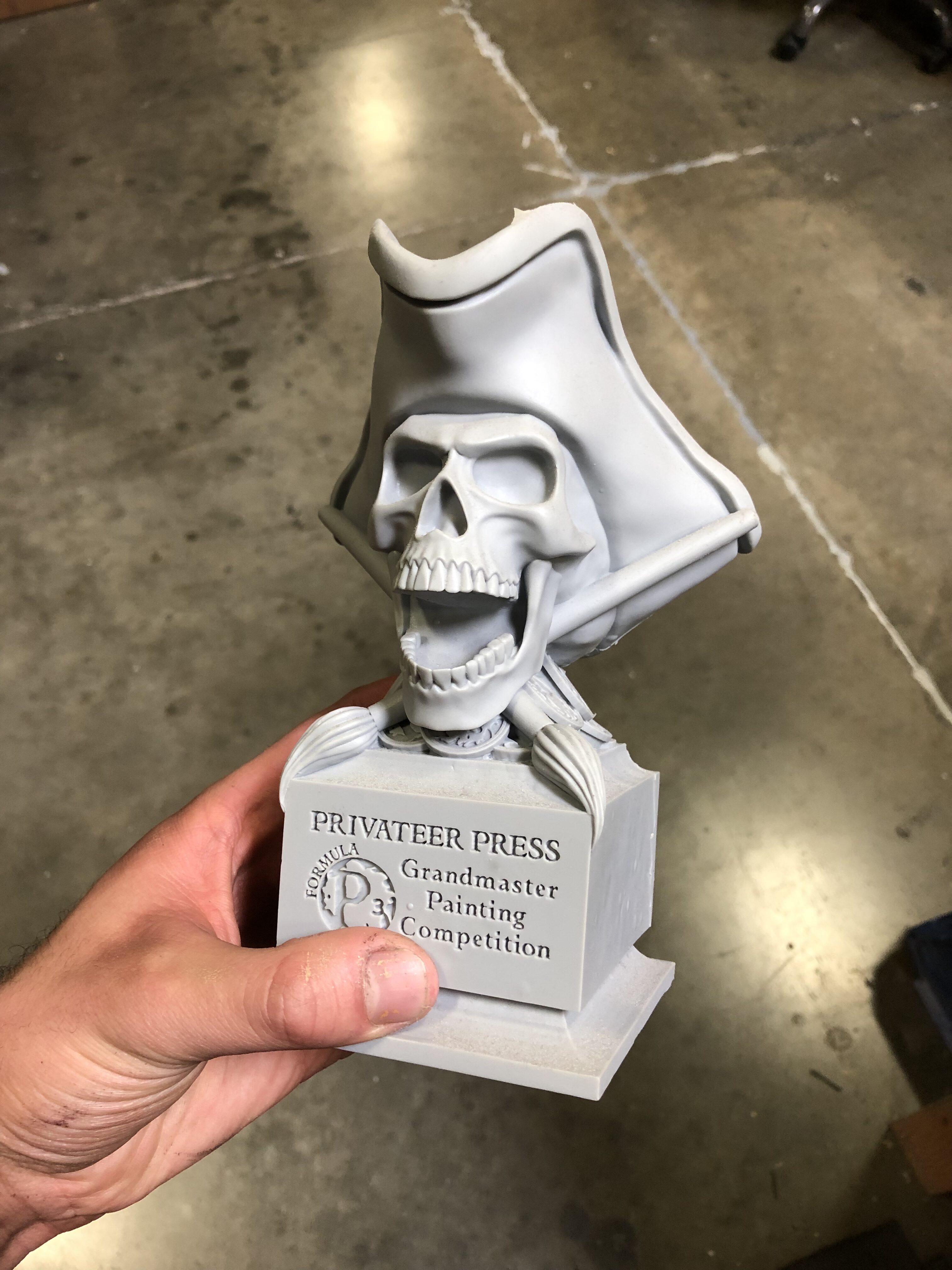 One of my jobs as hobby and terrain specialist for Privateer Press is to make sure we have amazing trophies for these events. Over the years, we’ve gone through a few different variations of trophies for this competition, but this one is by far my favorite. The original design was done by Art Director Mike Vaillancourt, and the sculpt was created by Stuart Spengler. After the digital sculpt was 3D printed, it was molded and cast in resin. You can see one of the castings right out of the mold below.