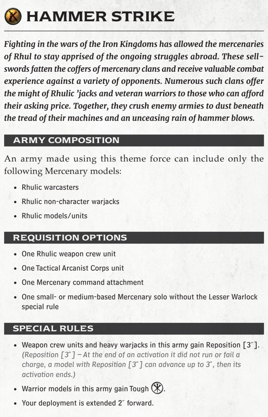 When we were splitting up the Factions for Oblivion theme force spoilers, no one was surprised that I’d be doing Hammer Strike. I’ve been filling this space with my love of all things Rhulic for more than eight years now, so I was thrilled to be a part of the discussions about how to adjust the theme force and then tell you all what was coming up for this very specific flavor of Mercenaries.