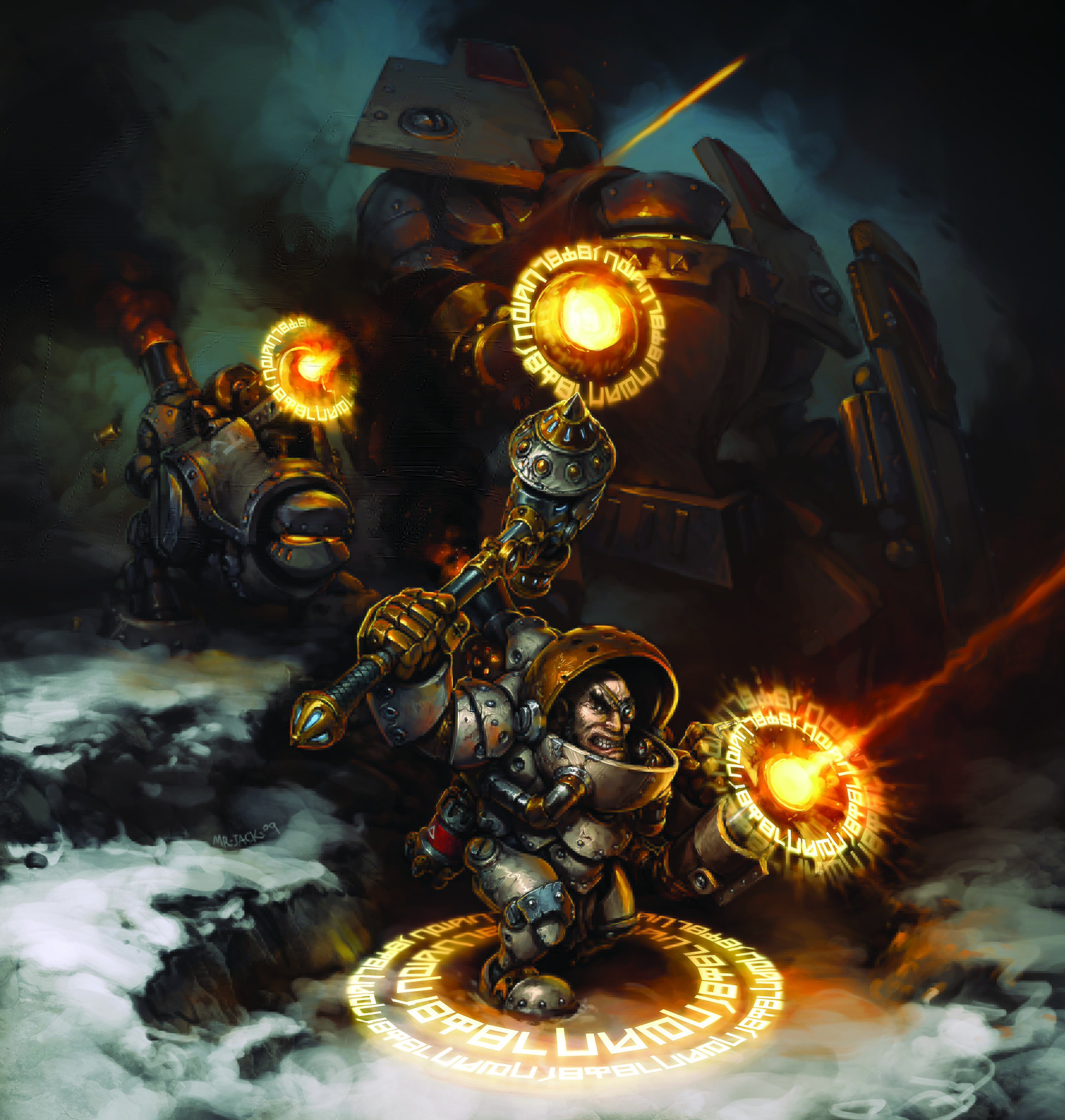 After settling on my core AOE bringers, I looked back to the battlegroup. My first addition was a Ghordson Driller for a bit of melee punch in the later game, but I considered including a Ghordson Earthbreaker since it’s seeing a point drop to 35 and getting a tiny speed buff. Going with the Driller, though, left me the room for a Grundback Blaster and a Grundback Gunner. The Earthbreaker is a big threat that would add a lot to the army, but I love the light Rhulic warjacks and think every Rhulic ’caster should have a couple.