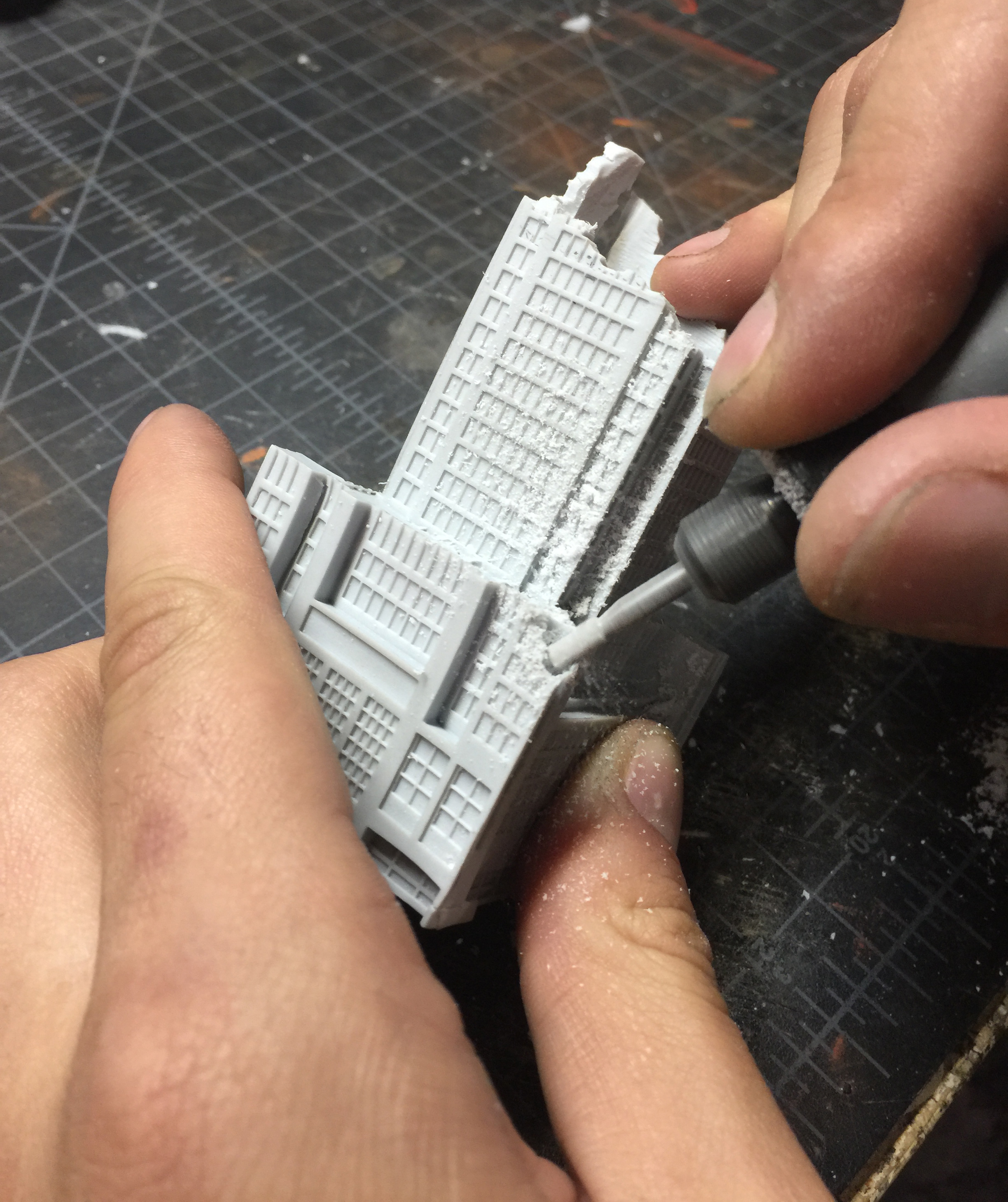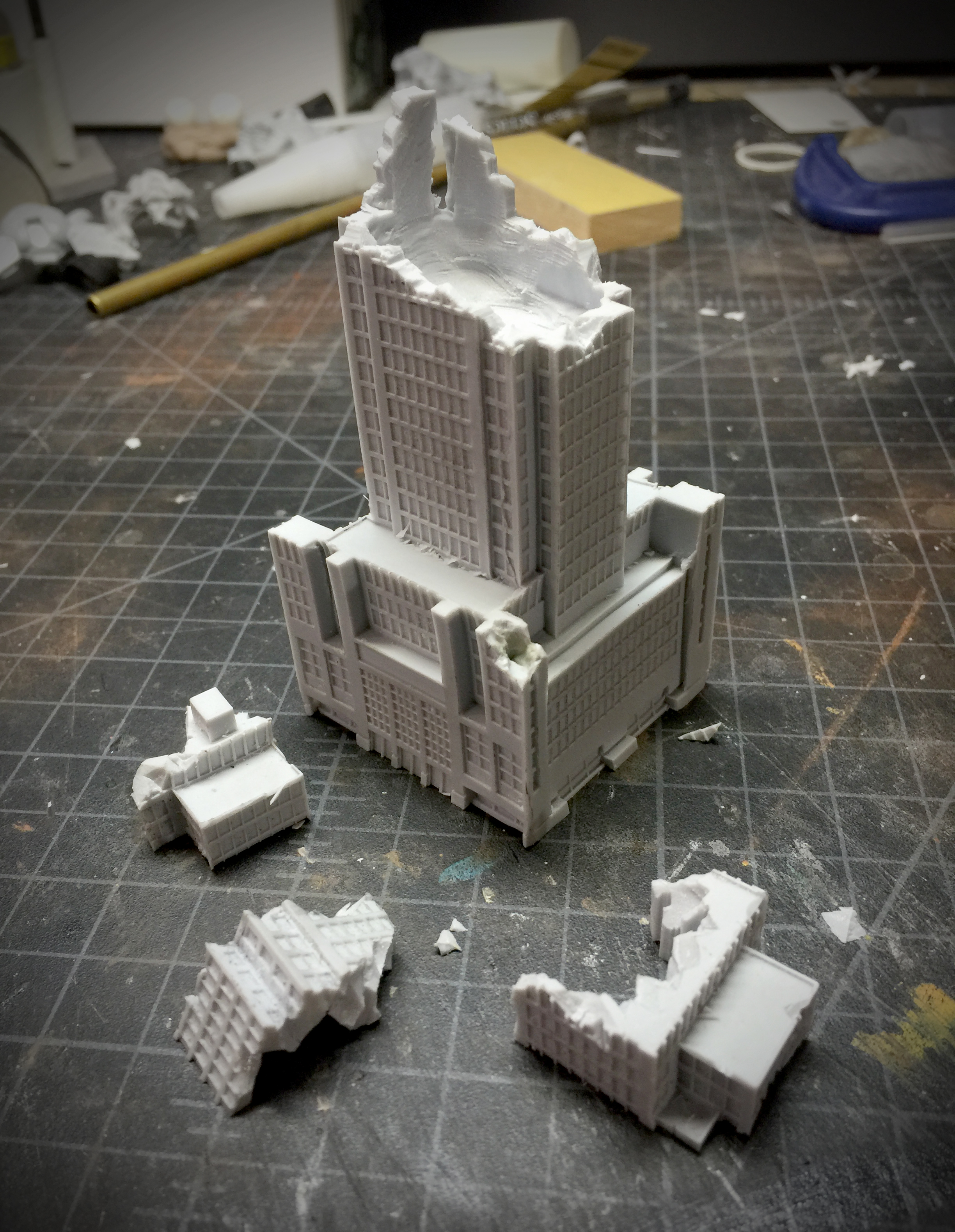 Hi guys! I was asked by a coworker to help him with a little side project: he asked me to destroy one of the buildings from Monsterpocalypse for something he wanted to do! I leaped at the opportunity because what could be more fun than taking a beautiful resin model and hitting it with a bunch of dangerous power tools. I will tell you! NOTHING!! Here is a quick rundown on how I did it.
