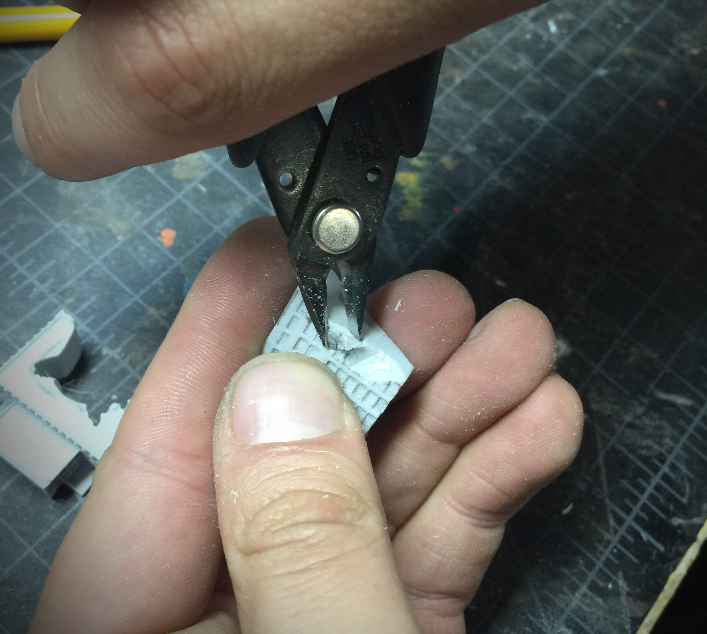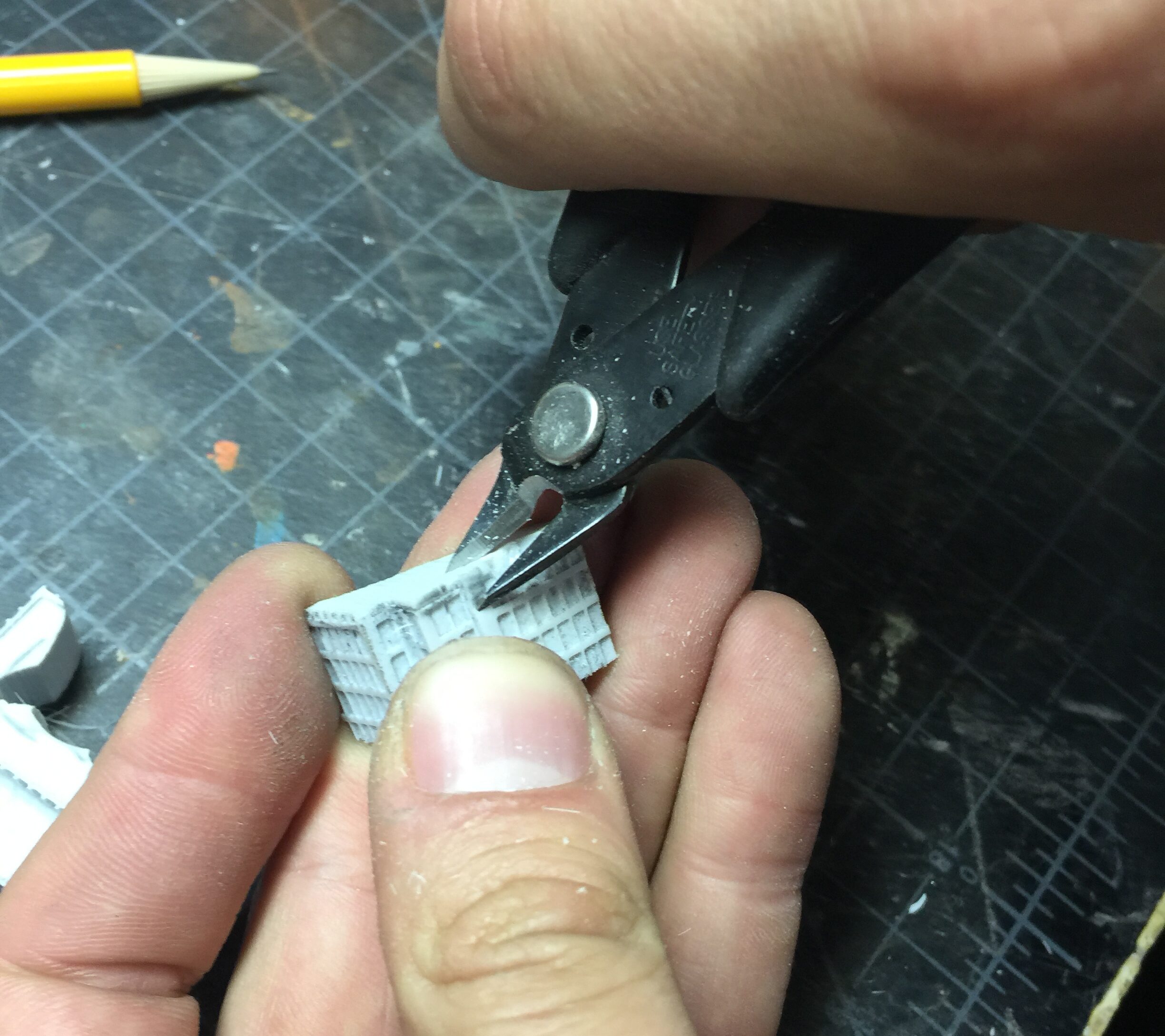 Using my hobby clippers, I take some of the scraps leftover from cutting the building on the bandsaw and gouge at them until they look wrecked and beaten as well. These can be used as embellishments on your bases. No reason to waste some good building chunks!