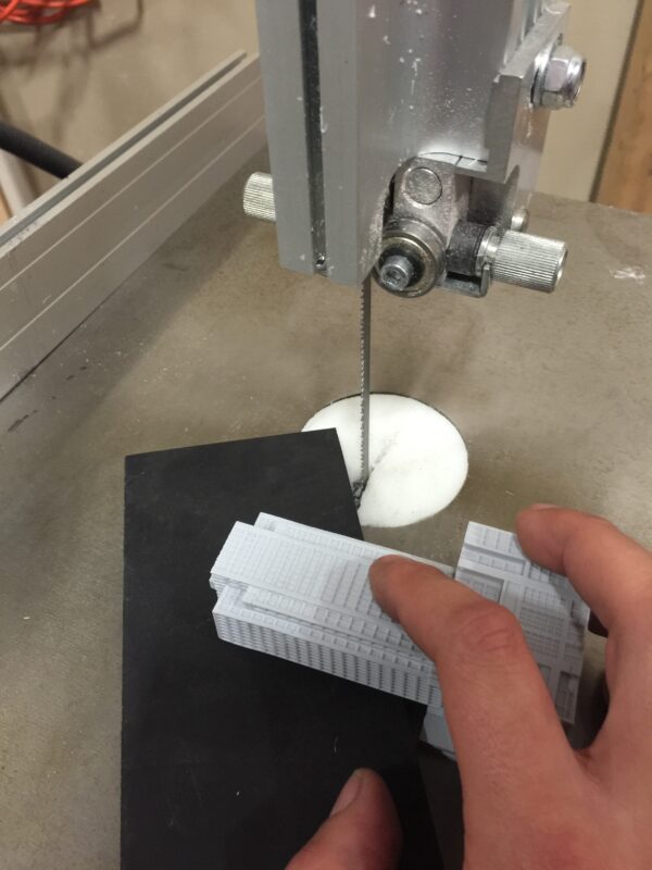 I begin by taking the building to the bandsaw and cutting chunks away from it. I am using a piece of black foam core and some double sided tape to stabilize the building while cutting. Always remember safety first!