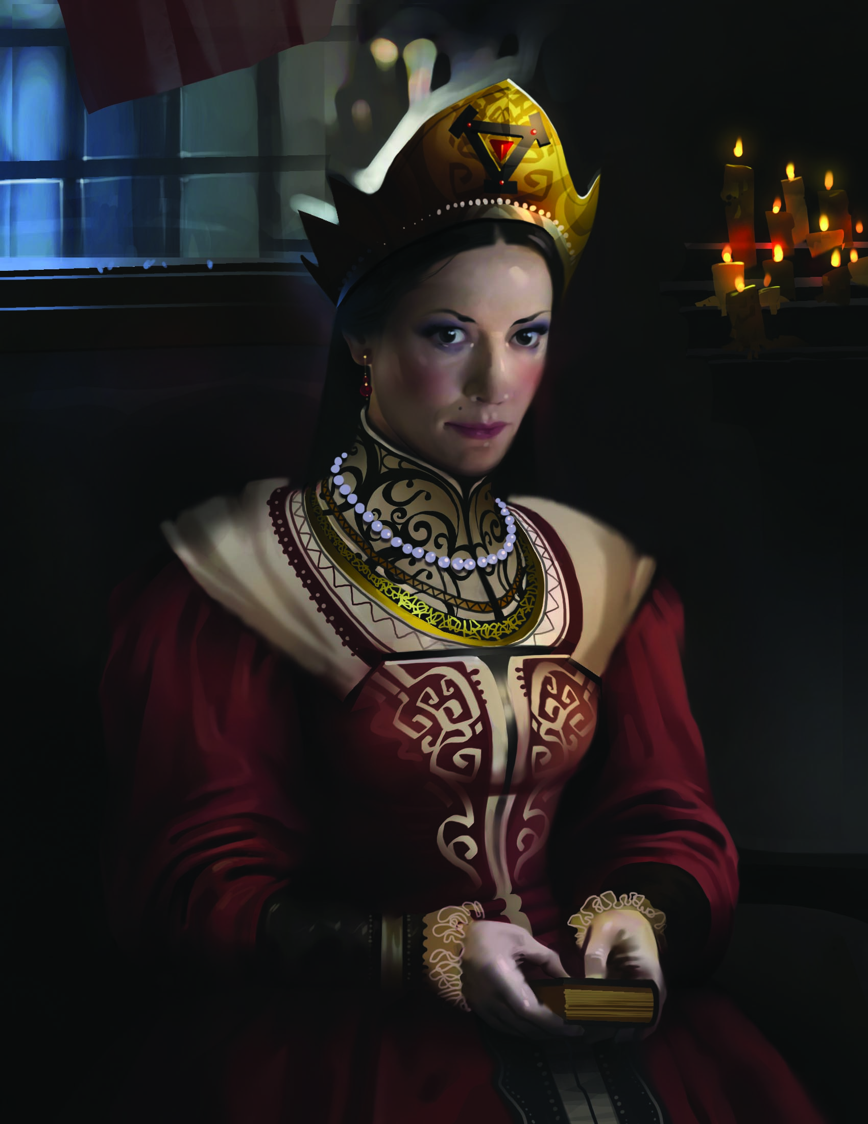 The ruler of Khador’s northeastern-most territory was a striking sight in her flowing white gown, looking every bit the “Winter Queen” as she was sometimes referred to by her subjects. This was rather different than the more martial attire she had worn the last time she had visited Korsk. She also wore her crown, a deliberate transgression, as it was rare for the great princes to retain any such adornment when paying their respects to their empress. Yet the rulers of the farthest regions were proud and enjoyed their independence. Ayn Vanar would have expected nothing less of Regna. Those who accompanied her included several subordinate nobles of modest standing, her advisors, and a small honor guard, though their weapons had been left outside the hall.
