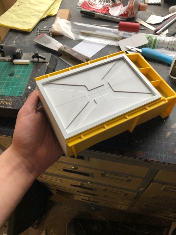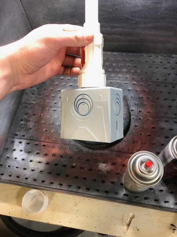 In this image below, you can see how I began to piece together parts of electrical junction boxes, styrene, and PVC pipes to make the base shape for the crane. If I’ve added a bunch of bits and bobs to something, I always prime things grey as I go—this allows me to see the overall build and not get distracted by lots of colors.