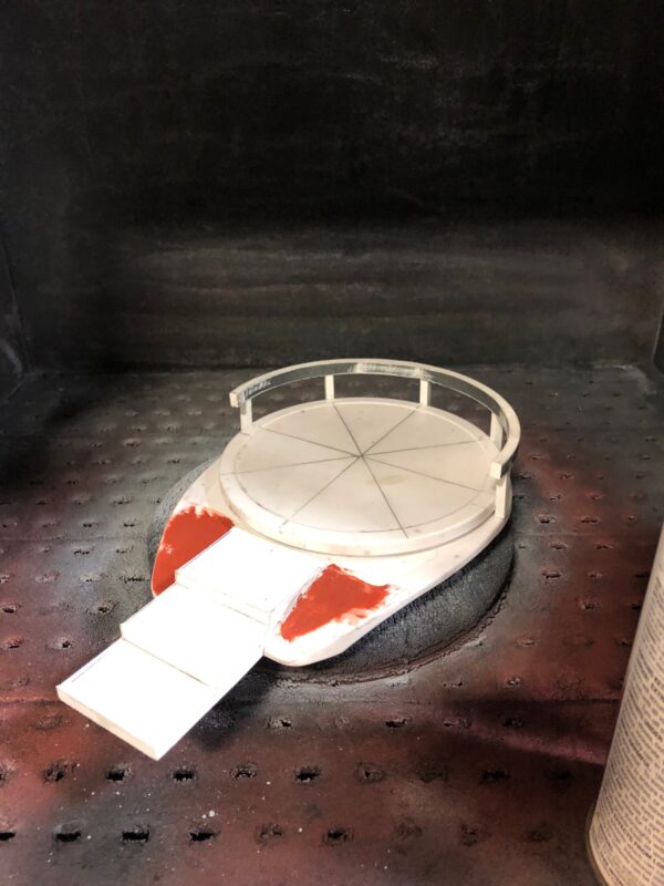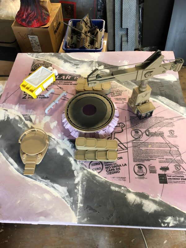 I started to block out other elements of the table as well; I began making switchback stairs from MDF that I cut on the band saw, as well as the top half of the crane (you can see the start of it on the left). It was also MDF. I ran out of grey primer at this point, so I switched to a can of red brown. I also added an interior circle made from styrene to the geyser platform. I think I poured resin into the big grove that the bucket would fit into on the lid to make it shallower as well, but I actually forget. WHOOPS!