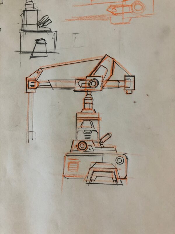 I did a quick sketch of the crane just to be sure I had the right idea about what Matt wanted. I knew, however, that a lot of the design would be determined by what sorts of kit-bash materials I could find. I normally tend to start with a sketch to generate a cool silhouette, but then my design gets determined further by what materials I find around my workshop and the office that are close to the desired shapes.