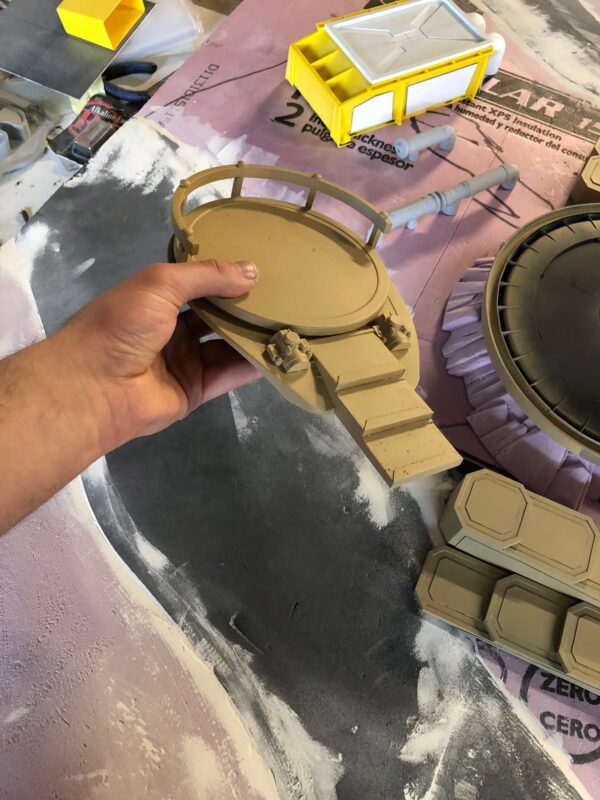 For the landing pad, I used an old broken kitchen scale, some styrene, and a section of large PVC pipe.
