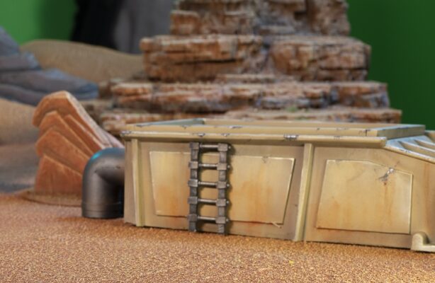 Danny’s piece used the custom resin-cast ladders originally built for various Crucible Guard terrain in 2017. Both Evergreen and Plastruct sell various ladder kits that would work here. Alternate types of ladders, such as stacks of sci-fi crates or some sort of gravity lifts could work, too! Everybody building along at home can use the final details to make this terrain their own. (For example, I plan to add a greeble scavenged from a tank model kit as a door control panel.)
