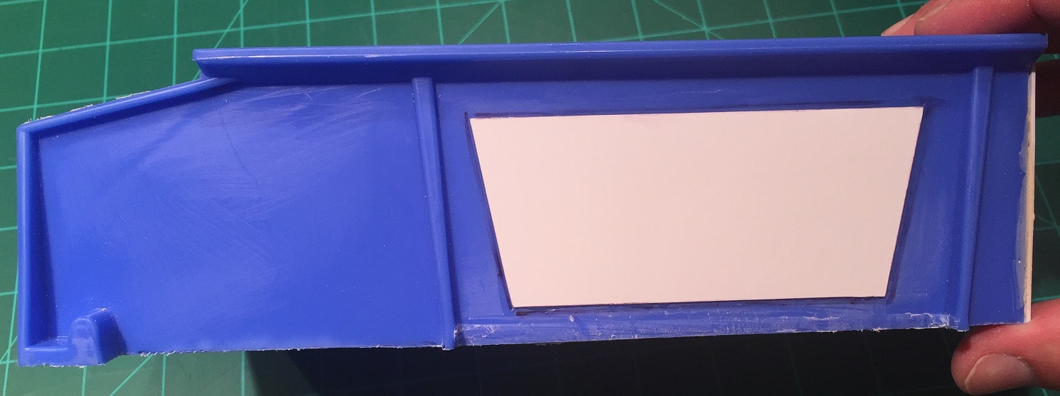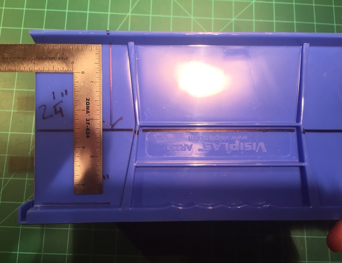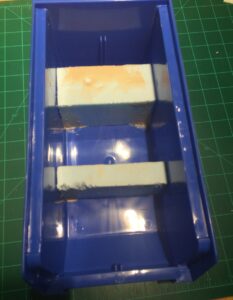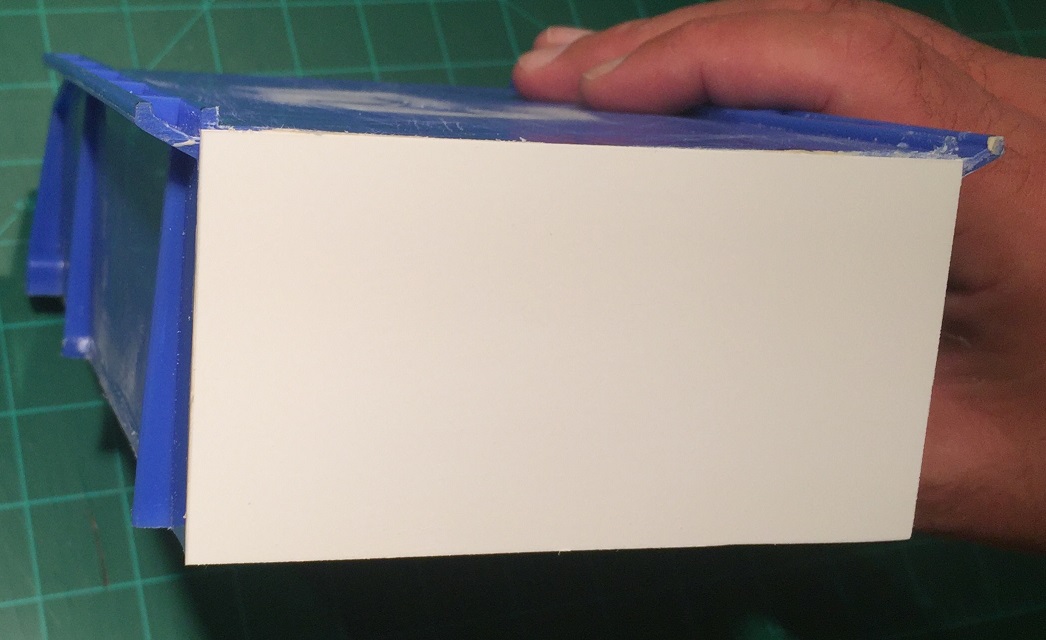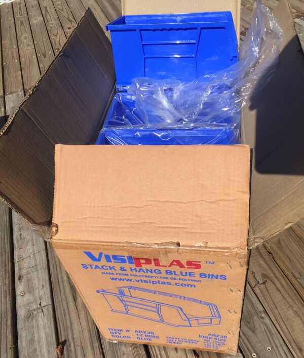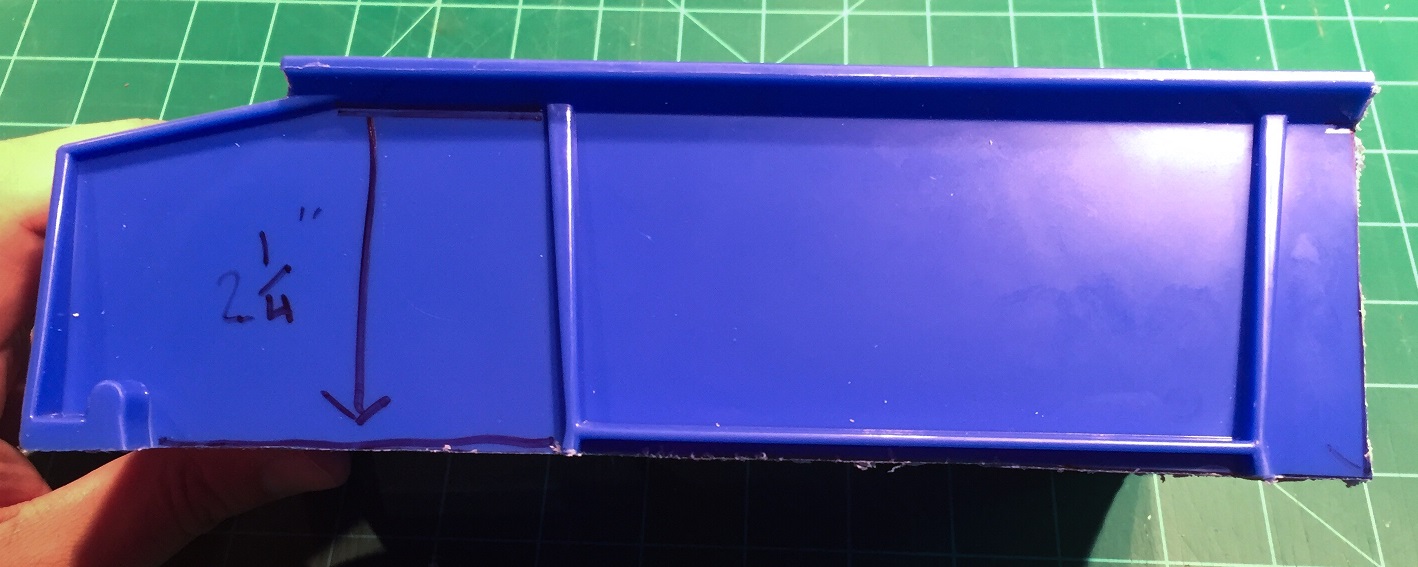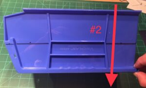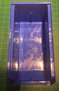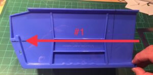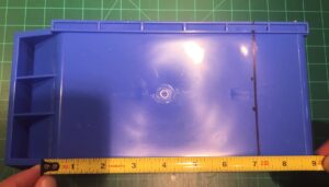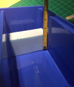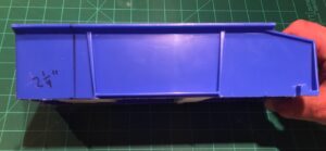 The storage bin used is specifically* a Rhino Tuff Bin ARTB-30˝ manufactured by Alkon Plastics. It measures 10-7/8˝ (L) x 5-½˝ (W) x 5˝(H). It’s sold under various trade names, including VISIPLAS AR230 in the United States.