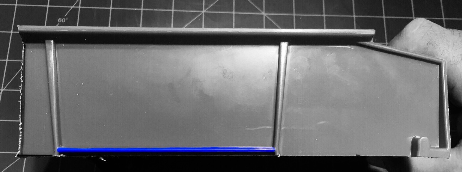Now, grab that hacksaw and get to work. Make the horizontal cut first and the vertical cut second. The bin is very wobbly once the rear is removed, making it difficult to cut clean lines.
