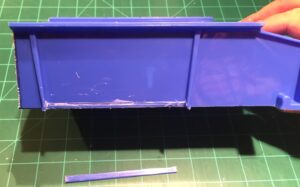 Glue one block near the rear rib, touching your vertical cut line. The foam must be flush with the rear cut. We’ll be adding plasticard here to make the rear wall later.