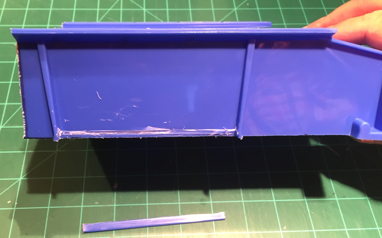 Use your hobby knife to remove the horizontal rib on each side. Then, use your hobby knife or razor saw to cut the horizontal rib loose from the two vertical ribs.
