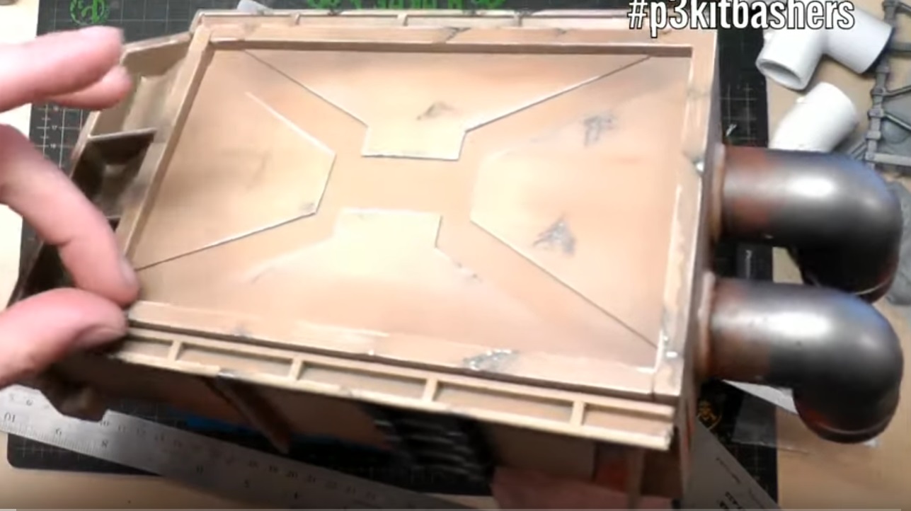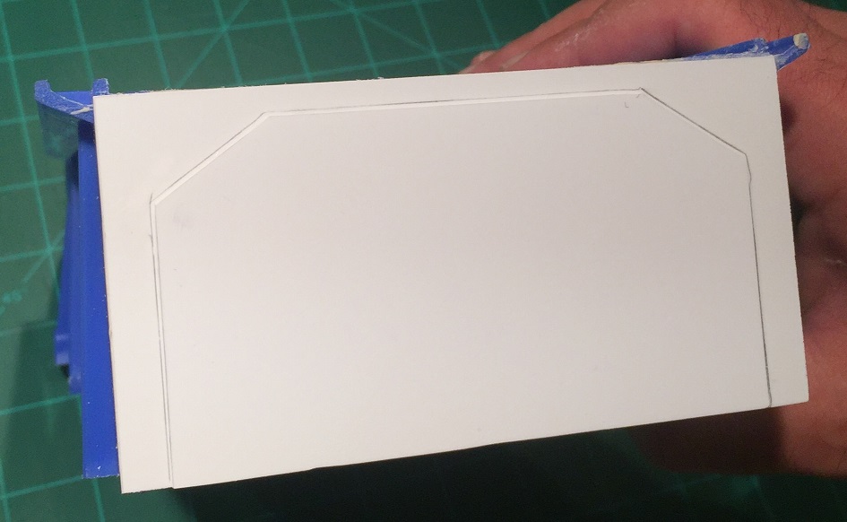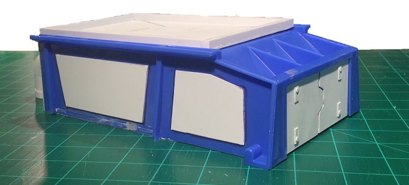 Center the sheet on top of the bunker, with the rear flush with the styrene sheet that forms the rear wall, and glue the full top detail in place.