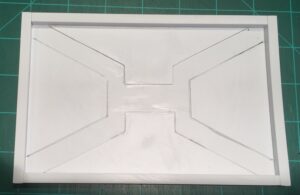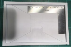 Cut the large rectangle out of the sheet. This will be used to cover the roof of the bunker and disguise the injection-molding site. This sheet, the cutouts forming the X detail, and the bars are a good example of the “three layer” visual language that Danny developed for the Marcher Worlds terrain.